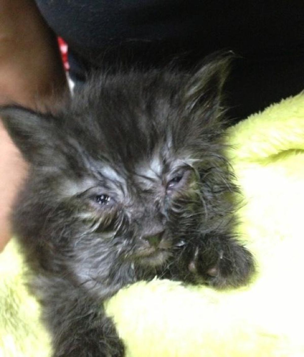 On a rainy day of May 2016, a little kitten was found on the roadside barely hanging on. He was drenched in rain water and covered in filth.