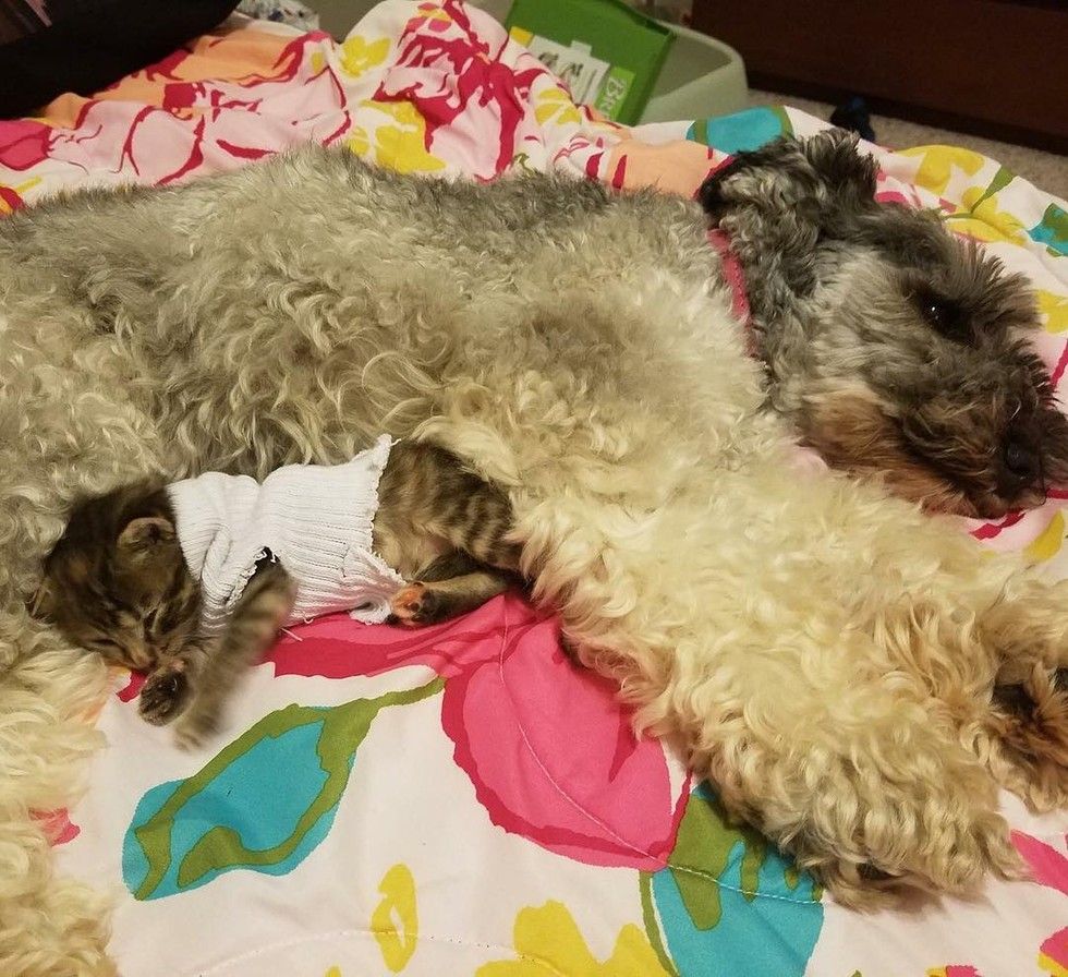 After little Pipes moved into her new home, she was welcomed by Amelie the dog and quickly snuggled up to her new friend for a nap.
