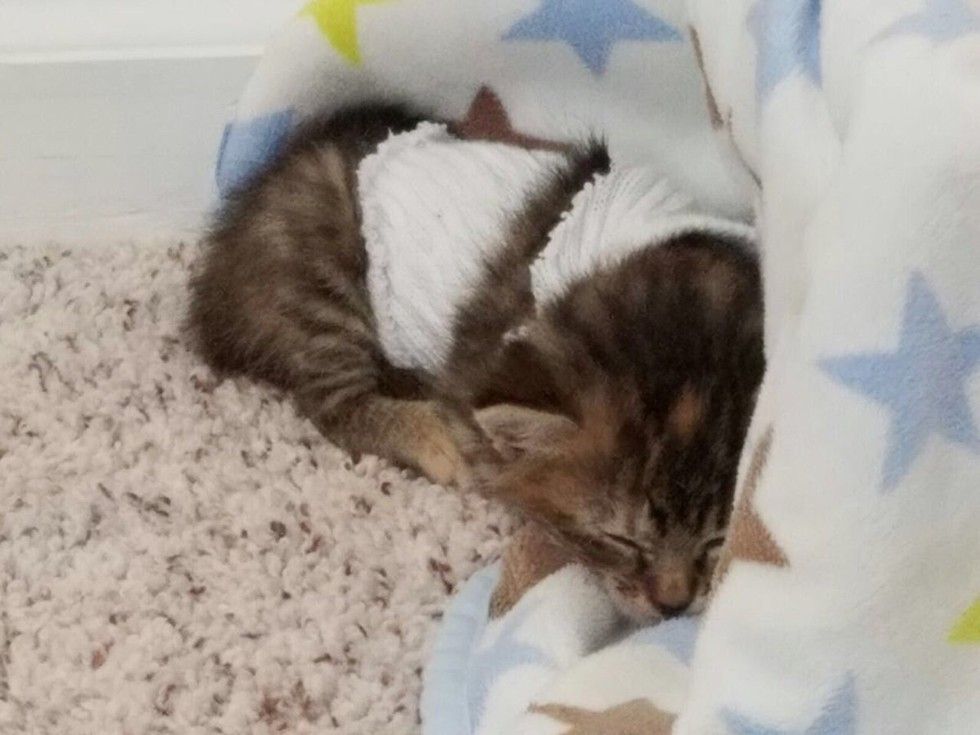 The tiny kitten in a sock sweater, who was found in the storms by Hurricane Matthew, is now thriving in her forever loving home.