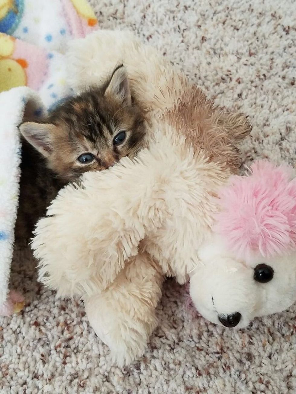 They bottle fed her around the clock and brought her a fluffy toy to cuddle and play with.