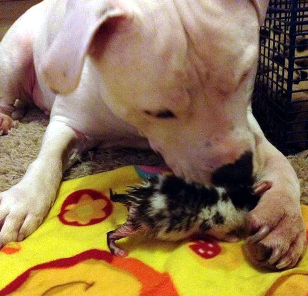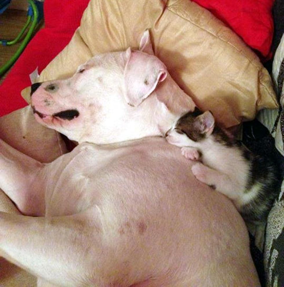 While the kitten is being hand reared by the shelter staff, she is getting extra care and love from two lovely dogs.
