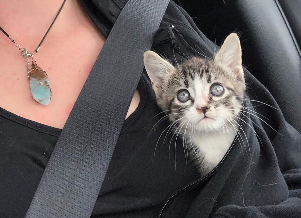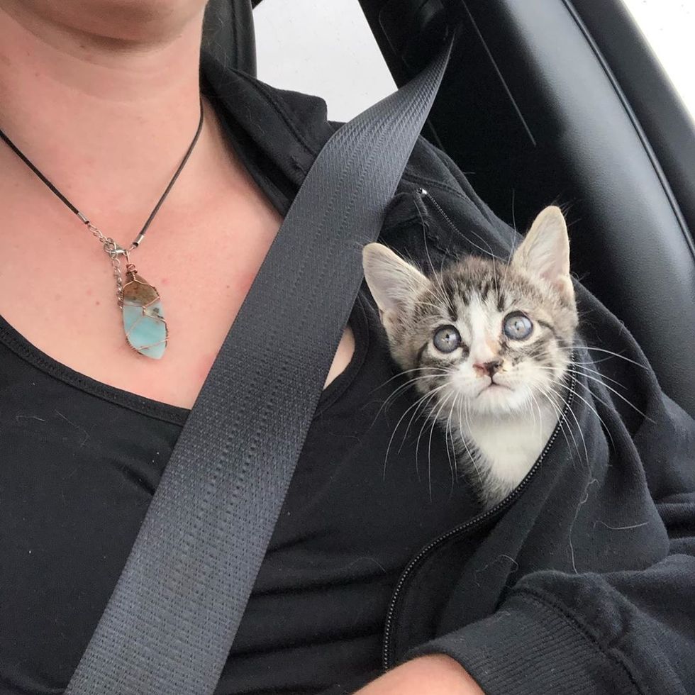Kelsey brought the kitten to her car and opened a can of food. The tabby was so hungry that she scarfed down as much food as her tiny body could pack in. After getting a full belly, she was purring and snuggling in her rescuer's arms for some much-needed TLC.