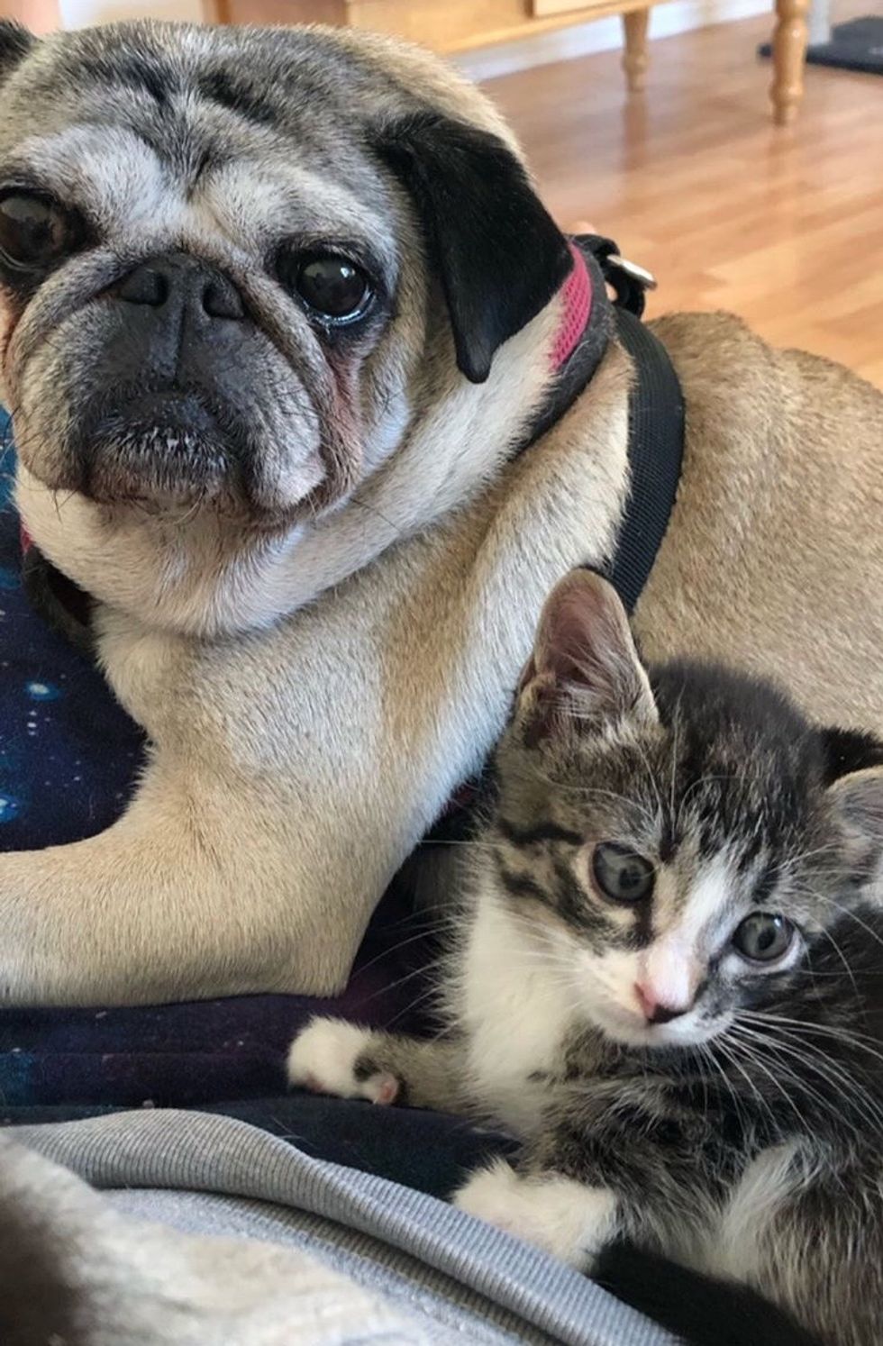 Christine's pug also came to give the kitten a warm welcome and some snuggles.