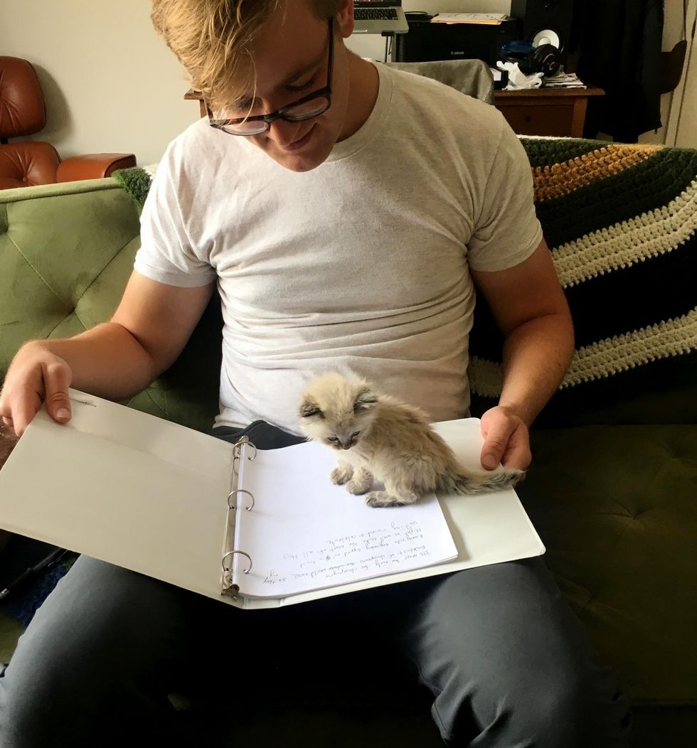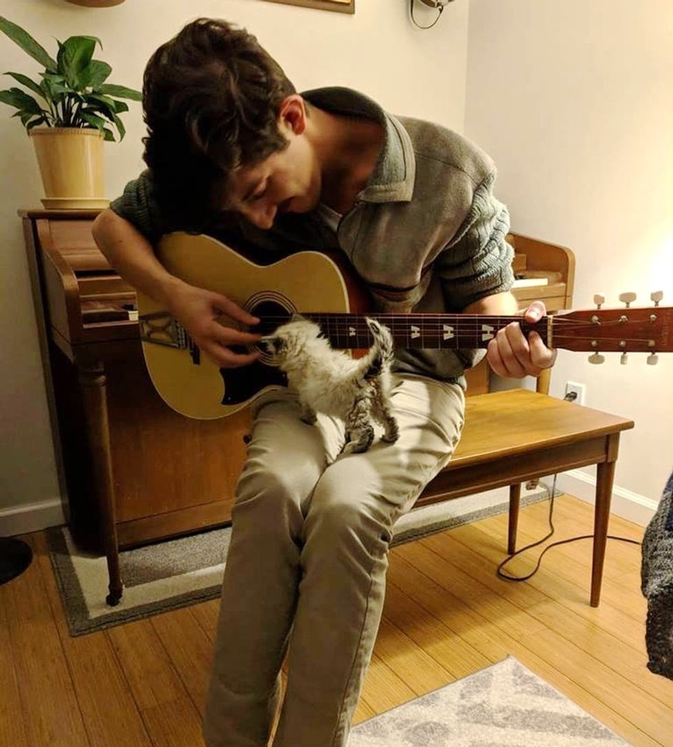 The curious little kitty loves sitting on her foster dad's lap while watching him play the guitar.