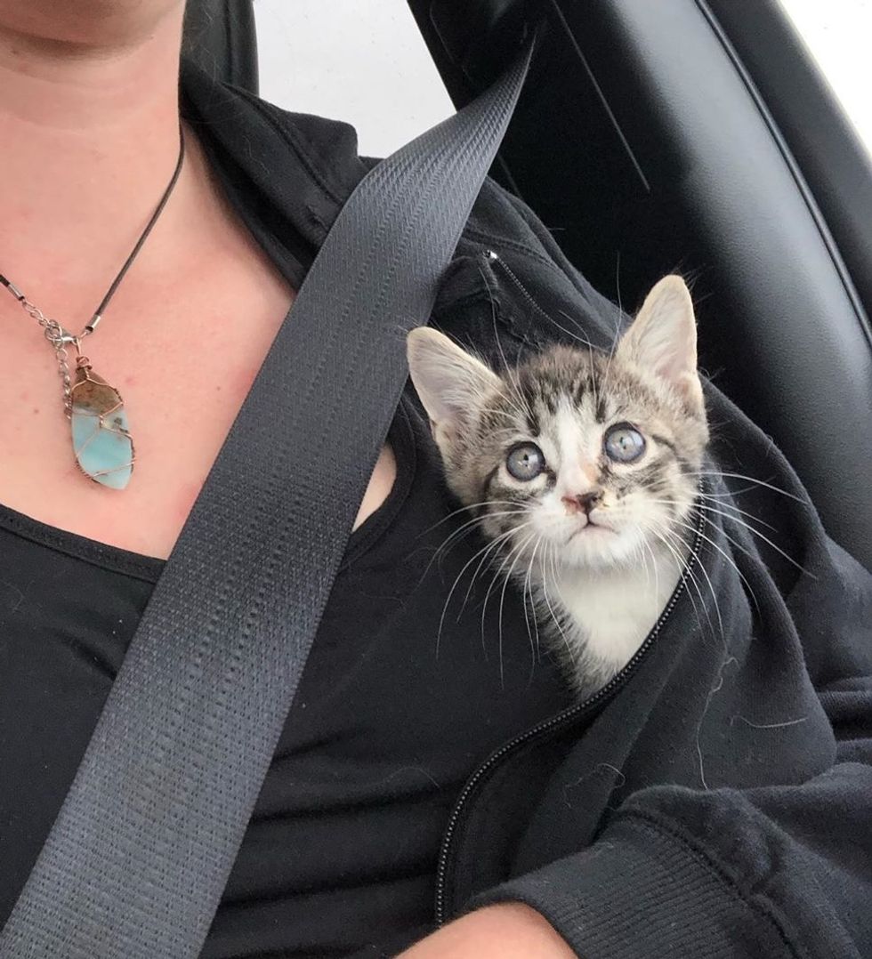 The tiny bundle of fur was so thankful and just wanted to cuddle. After getting some food in his belly, he curled up in her jacket and purred up a storm. "(He) accepted (his) fate of being rescued and loved every second of attention I gave (him)."