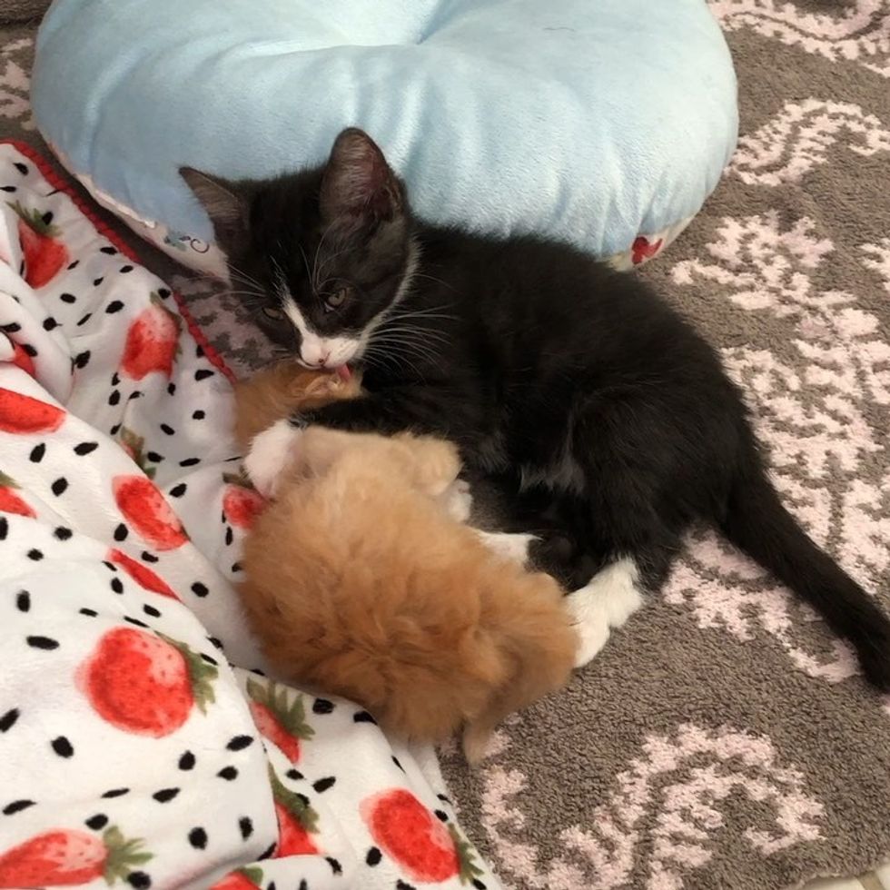 Knowing that he needed a friend, they decided to introduce him to a litter of foster kittens his age.