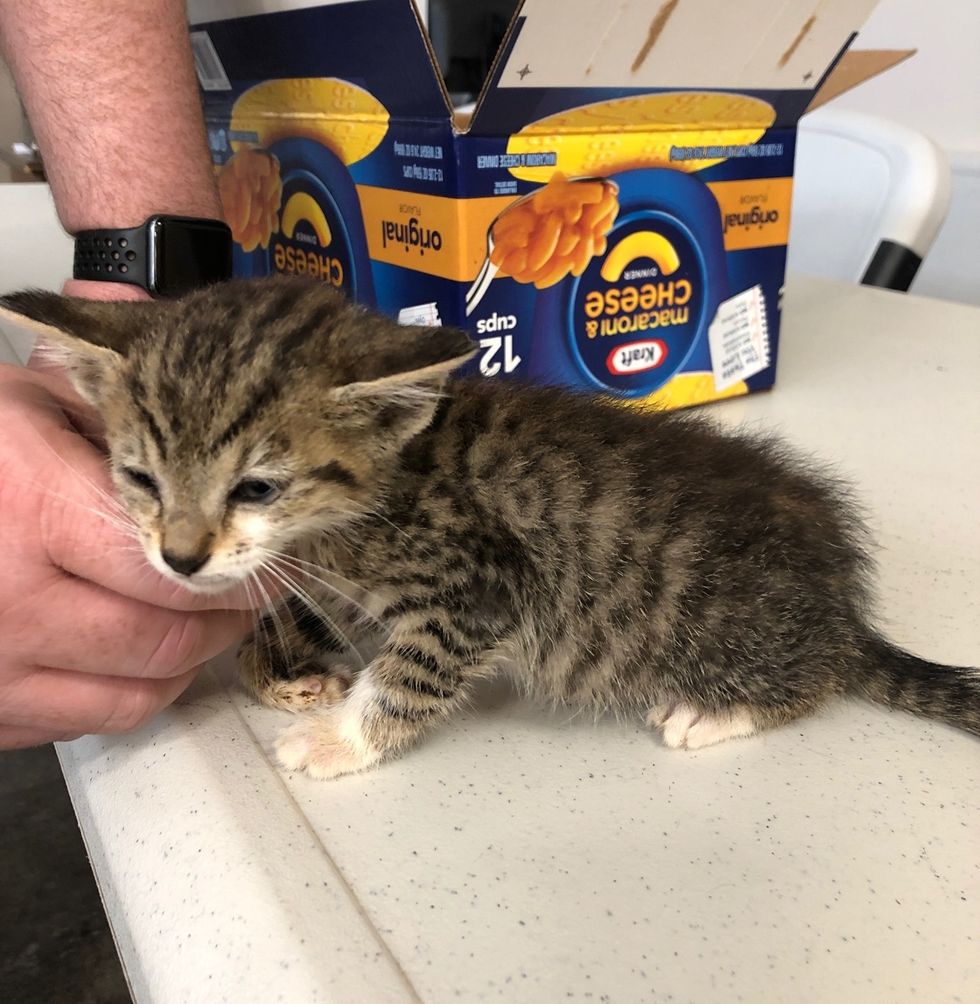 Moxie the tabby was rescued by a Good Samaritan when he was traveling on I-40 going through Mocksville, North Carolina. He spotted the tiny kitten all alone on the side of the road when he was stalled in construction traffic.
