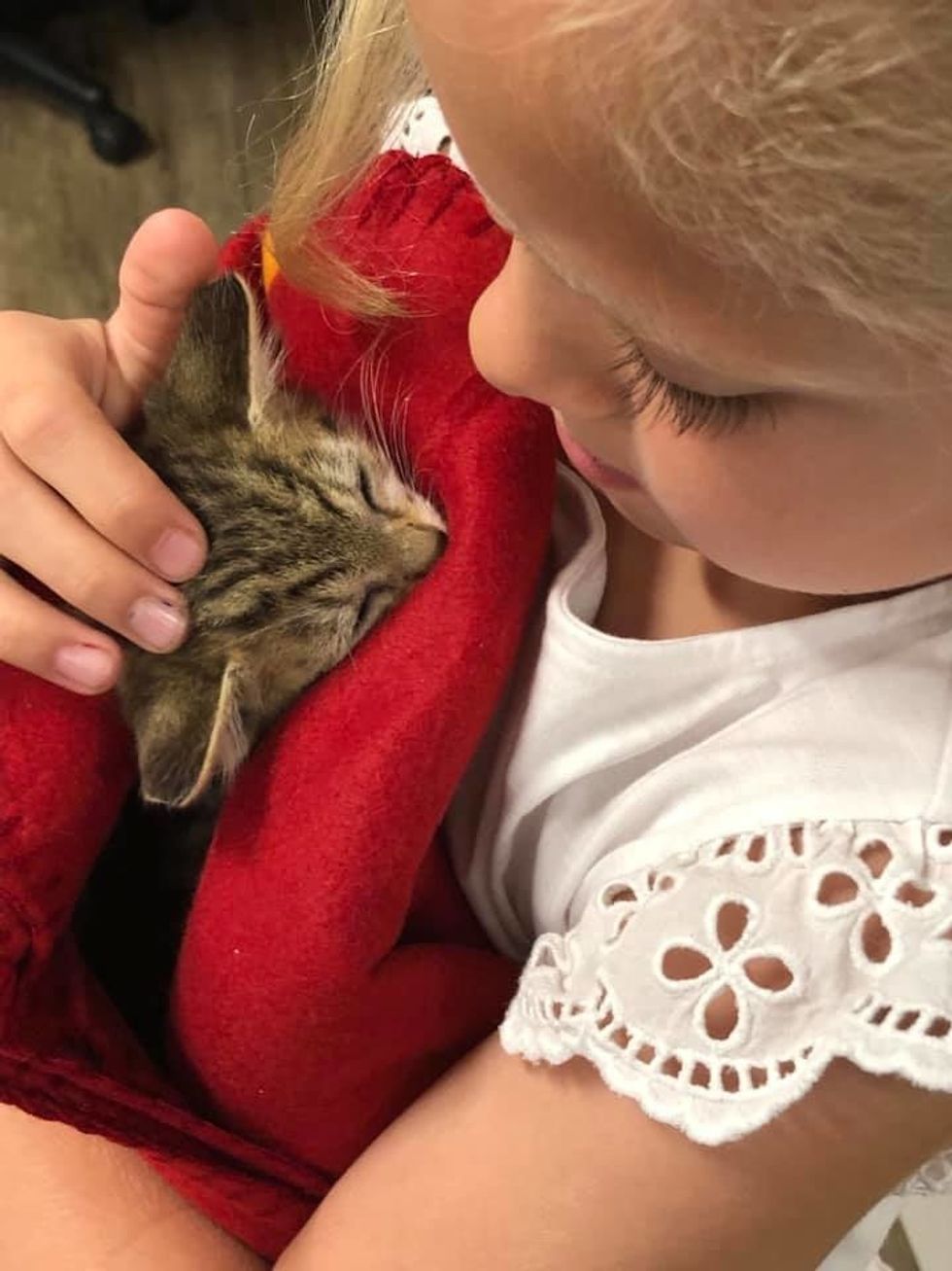 When 7-year-old triplets came to visit her, the little tabby surprised everyone with how good she was with children. "She was just happy to be held and loved. She even fell asleep in the midst of their holding. It was adorable."