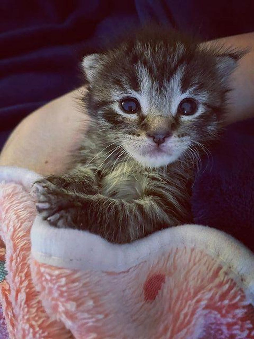 Once Jason got a close look at the kitten, he was shocked by the deplorable condition. "The kitten was incredibly small, curled up next to some bricks and there was a dead raccoon about a foot from him."