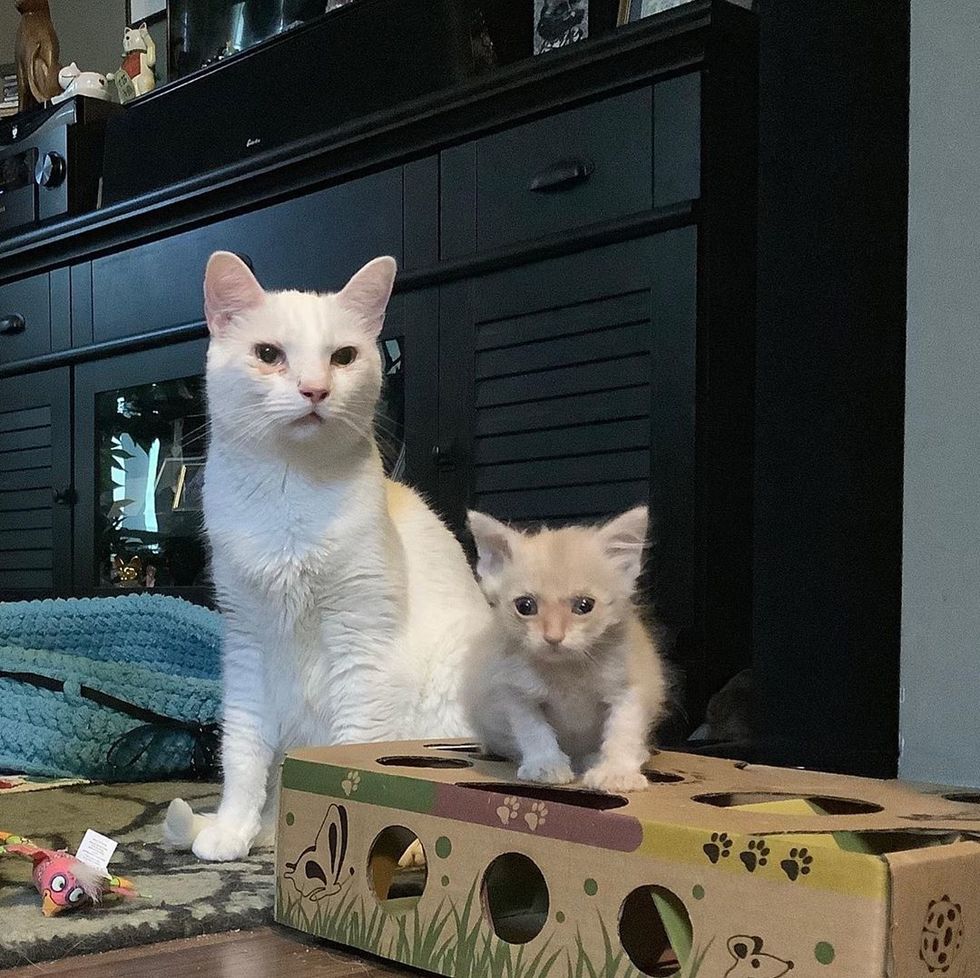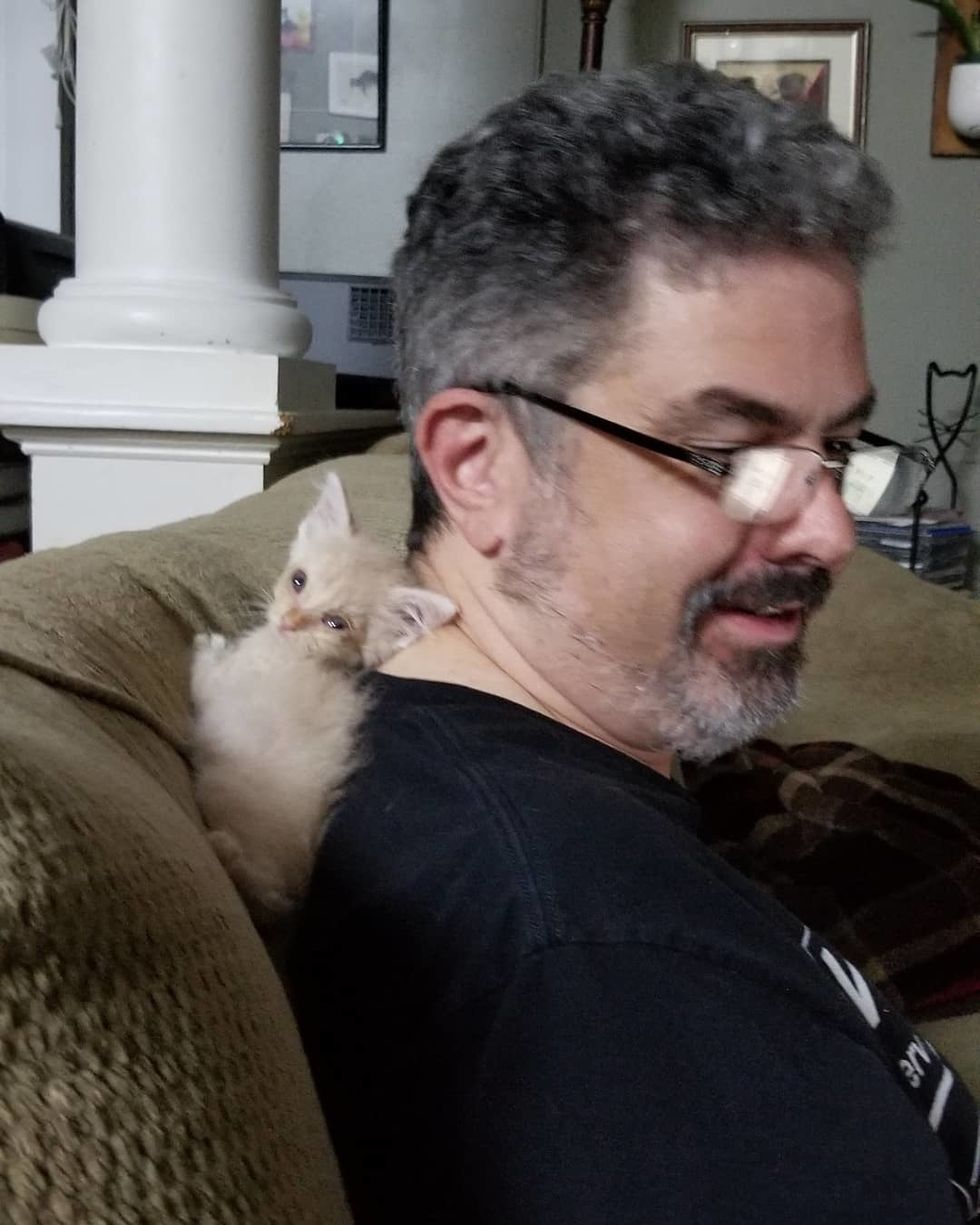 Their resident cat Benny who has helped countless rescued kittens, has taken the little guy under his wing. As soon as he wakes up from his nap, he gets back to his dad patrol and watches over Mort every step of the way.