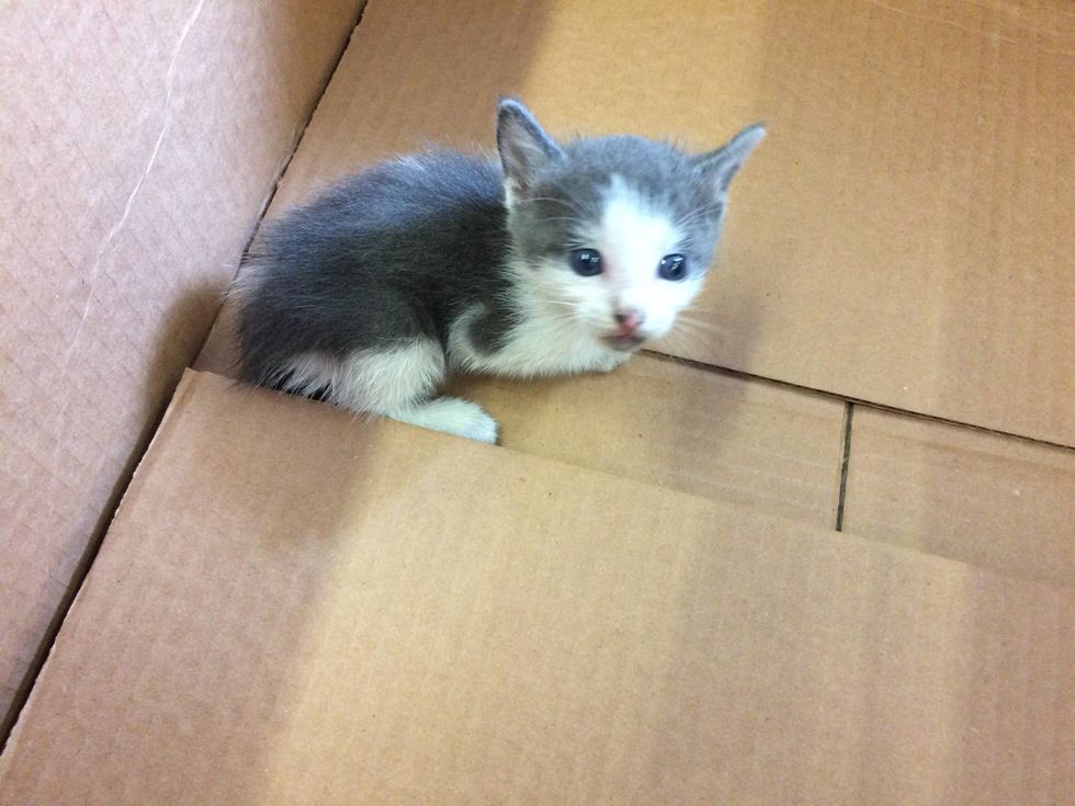 After the storm, this tiny kitten showed up at a workplace, looking for food. He quickly caught the attention of the workers there.