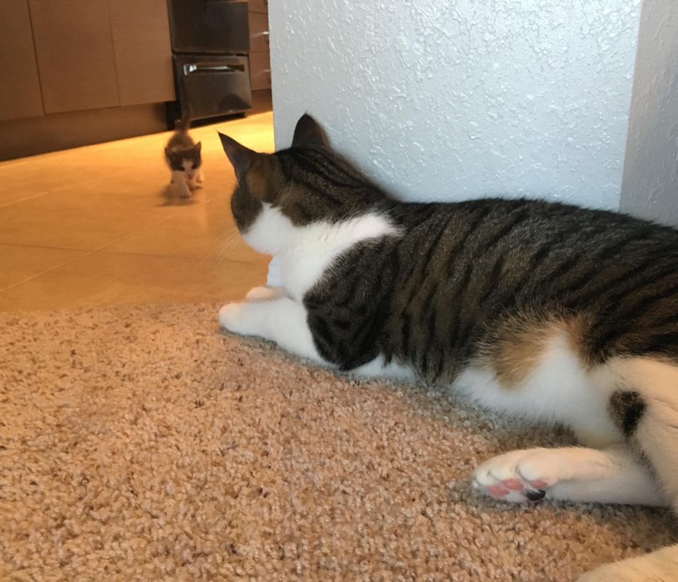Their 5-year old cat Murphy surprised the couple by taking the little guy under his wing.