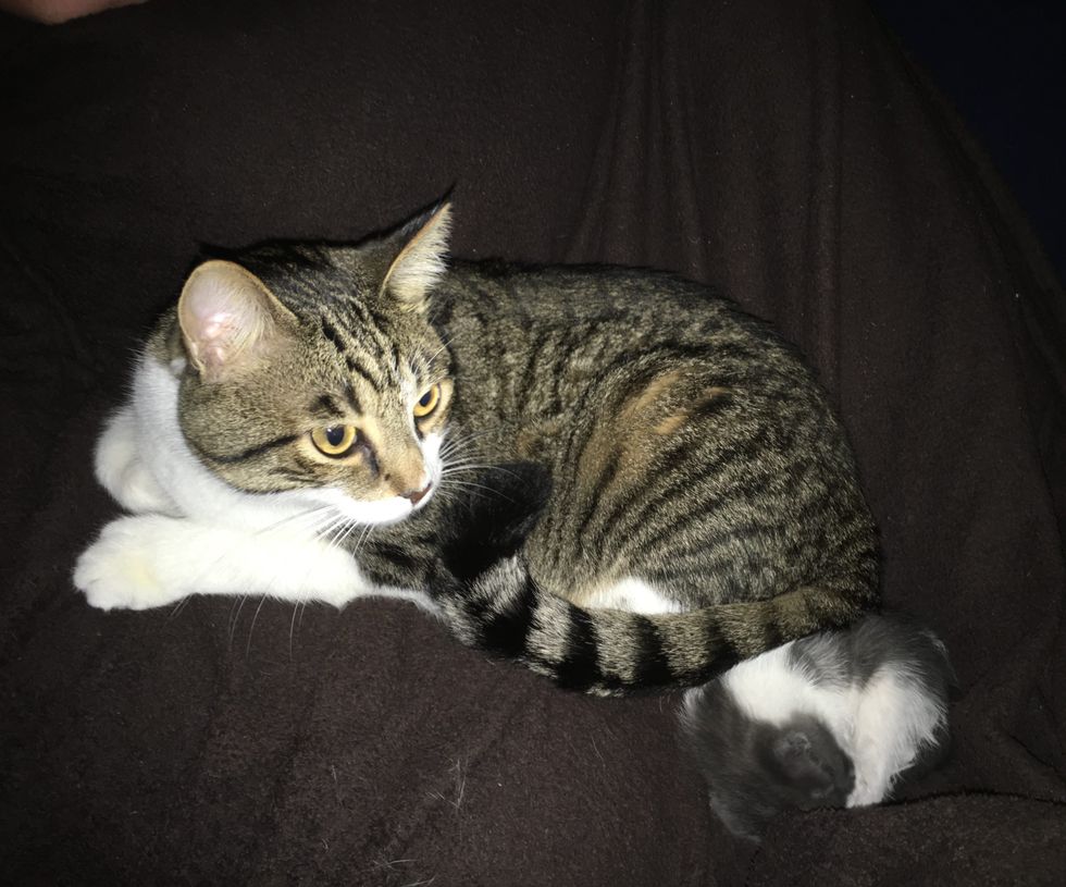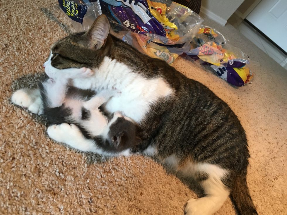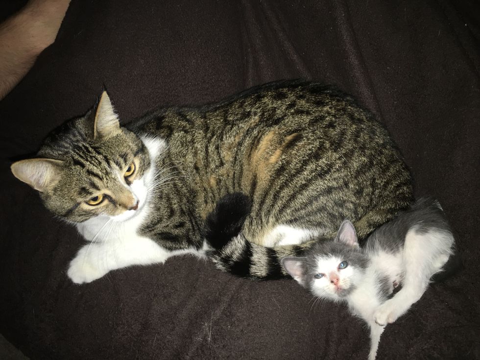 The little kitten who survived the storm, has found a forever home and a big brother to cuddle with every day.