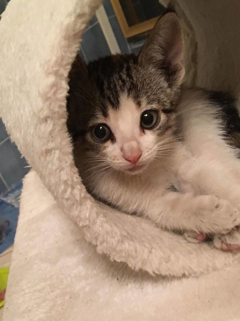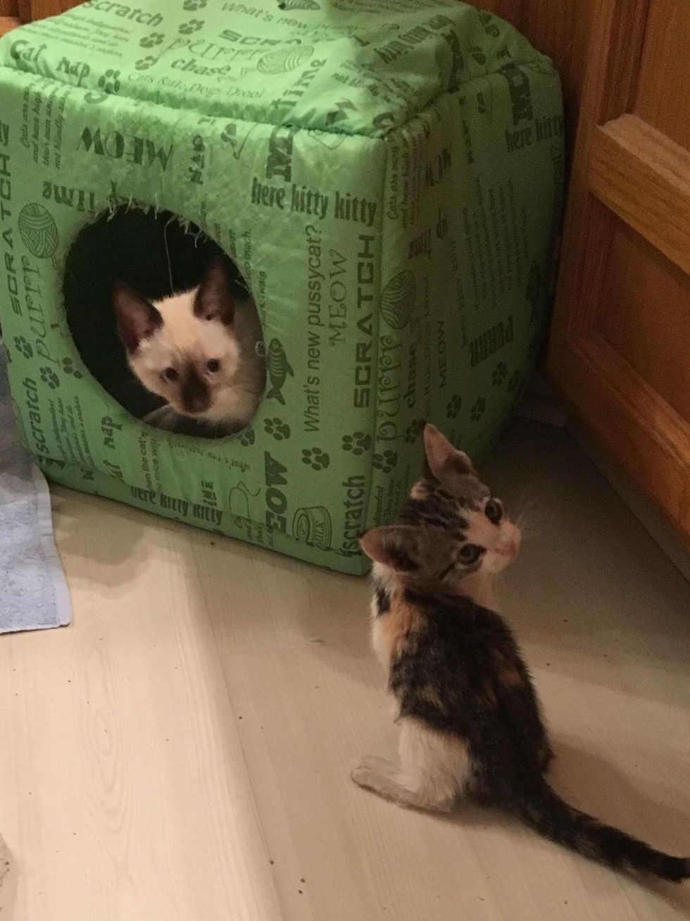 To help socialize the kitten, they paired her up with another foster, Chin Chin, and the two just hit it off.