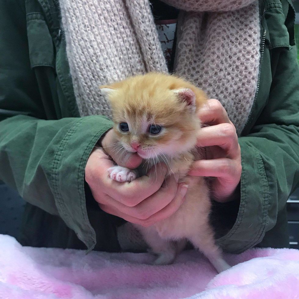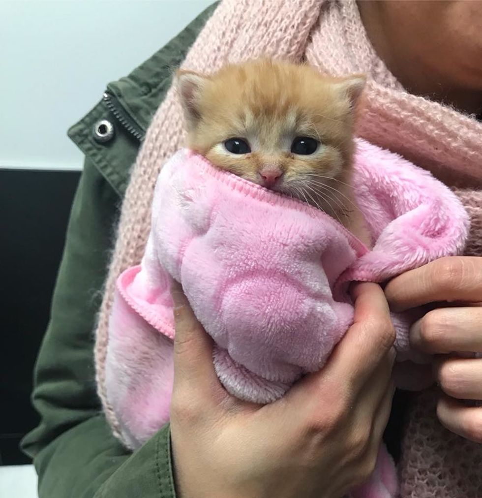 A tiny 2-week-old kitten was found wandering alone on the streets, trying to survive the bitter cold.
