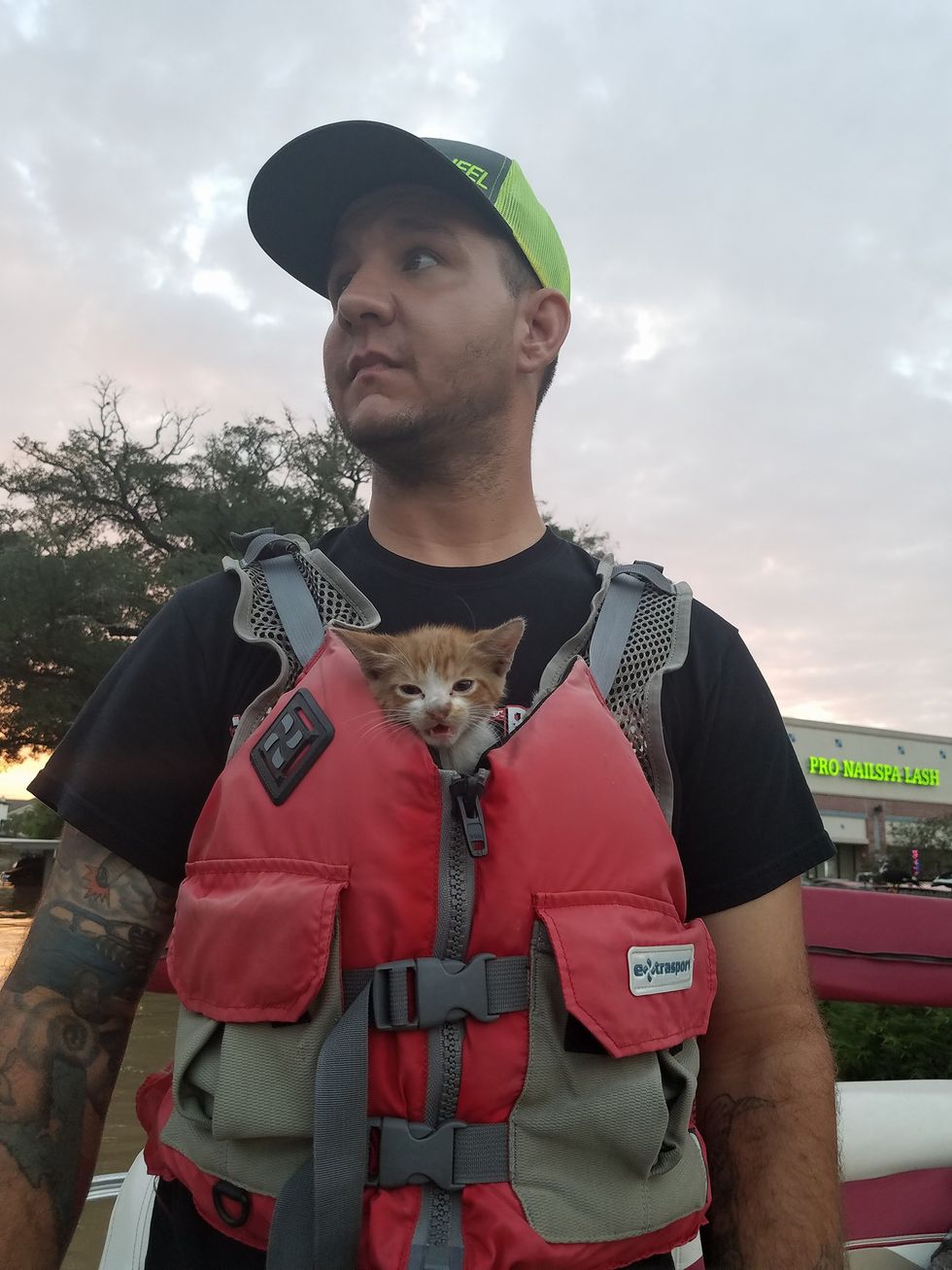 Cameron lost his dog to the floods, and the whole family was devastated especially his daughter. "She has been asking for a kitten so he took him home. Harvey now lives in Montgomery, Texas."