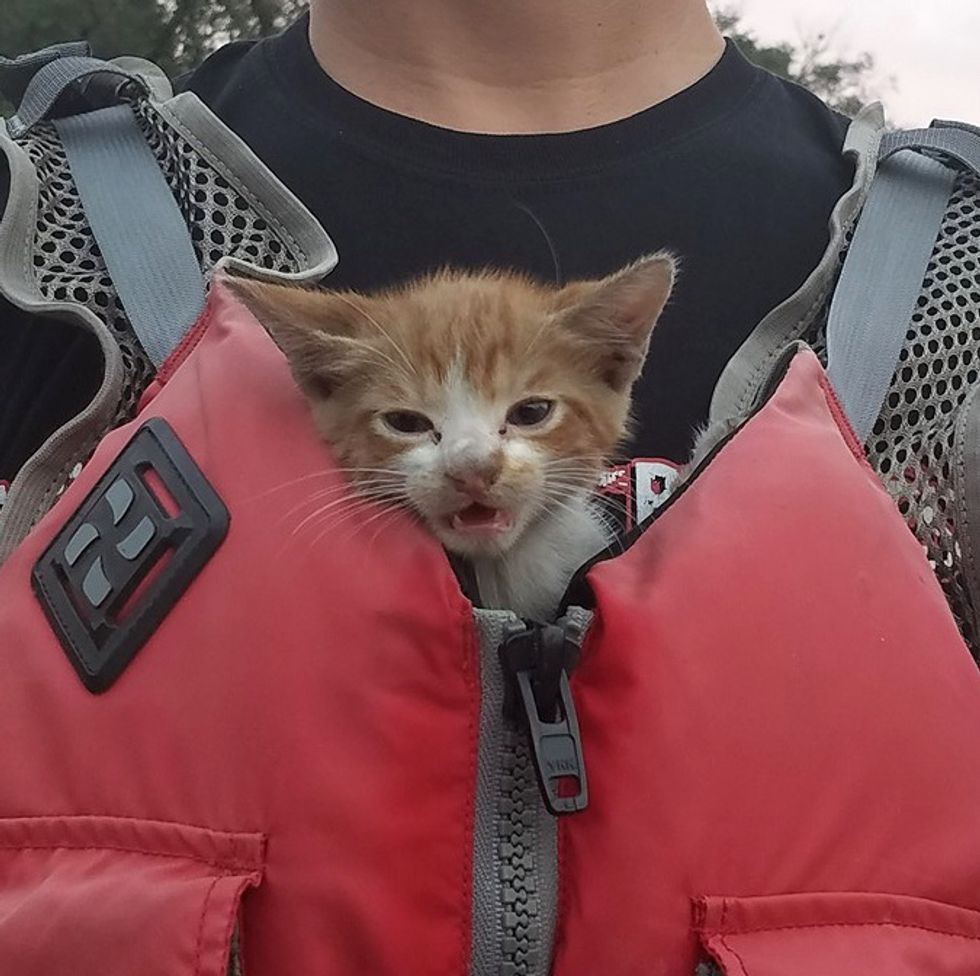 "Once I crawled back in the boat I picked him up and set him down inside my life vest. He rode in there for about an hour before he calmed and became comfortable enough to come out and explore."
