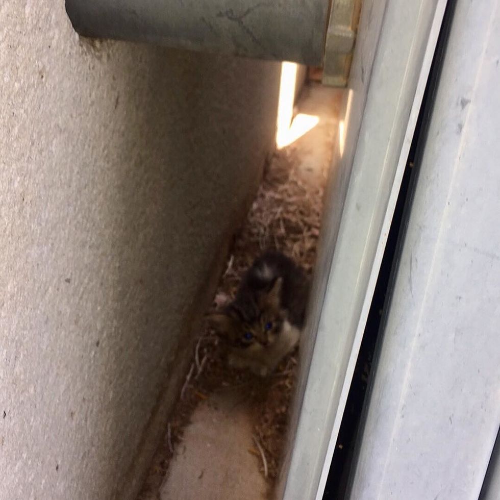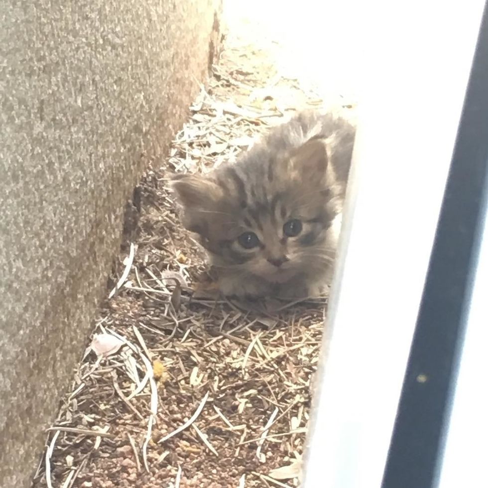It turns out that a security guard had seen a mama cat carry her babies, one by one, early in the morning. They believe that this kitten had gotten lost or left behind. She was running away from everyone that tried to help her.