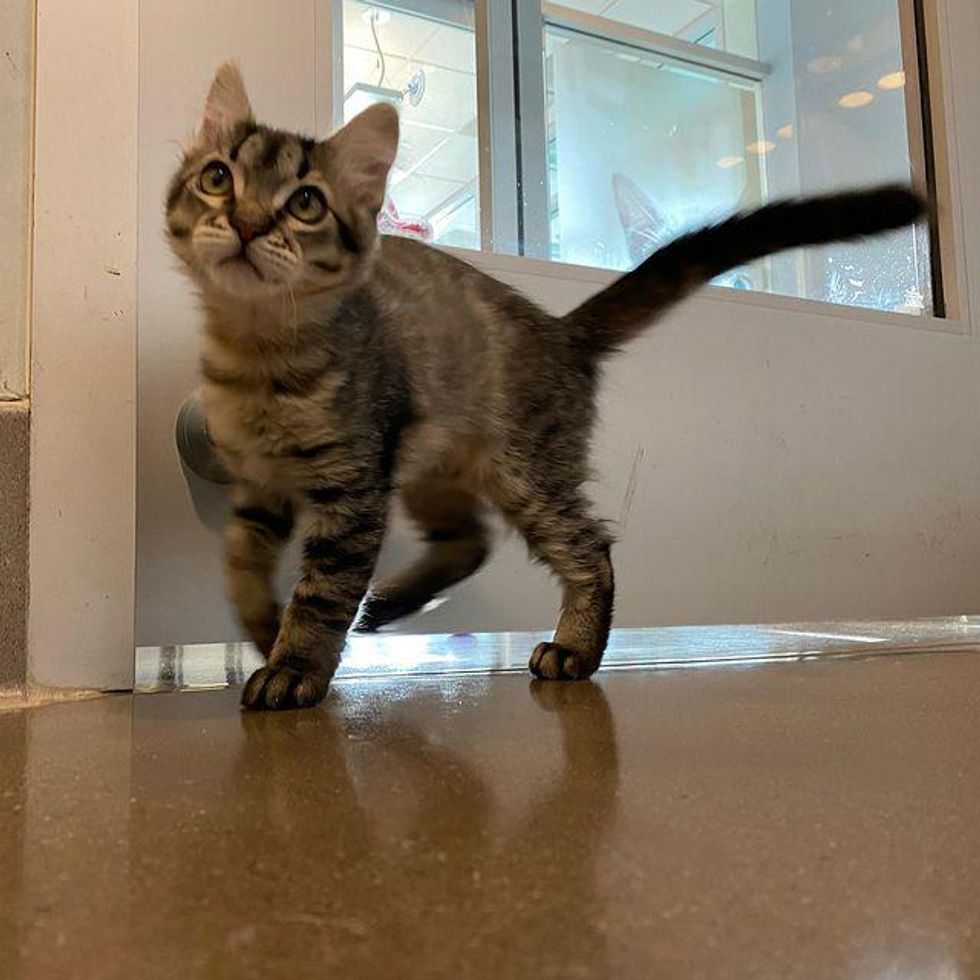 The sweet tabby waits eagerly behind the glass, showing off her adorable ear tufts, toe beans, cute belly and big eyes. She is ready to win a family over with her whole heart.