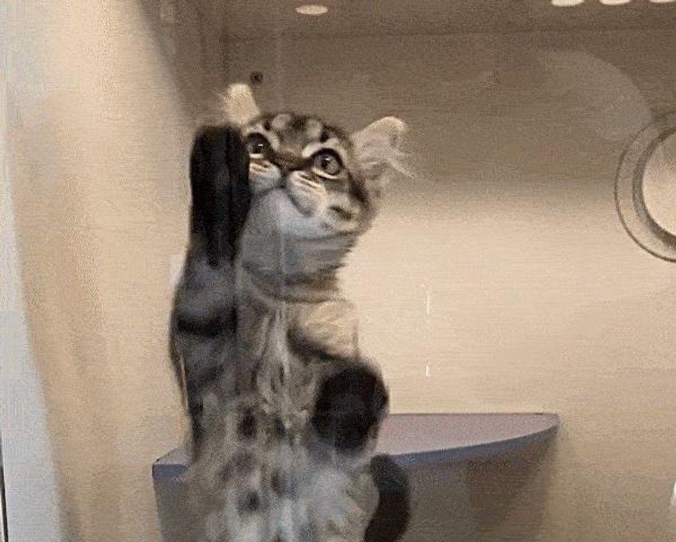 A kitten tries to get people to notice her at the adoption center with her adorable "window washing."