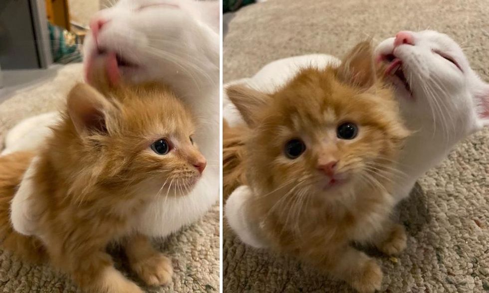 When they locked eyes with each other for the first time, Coconut immediately took to the kitten and started grooming him.