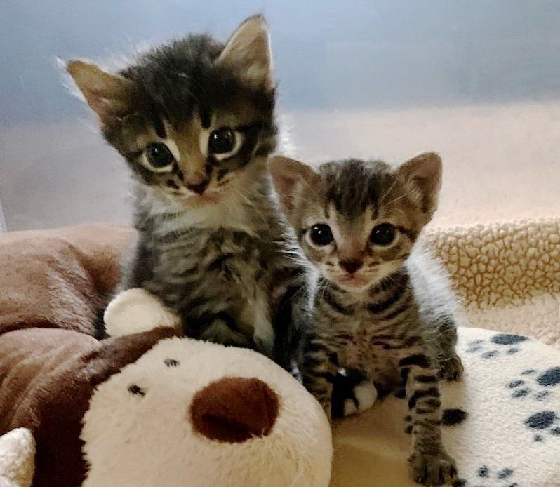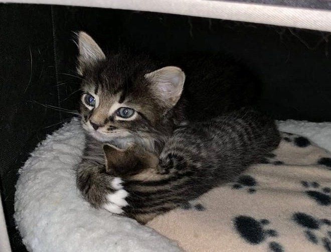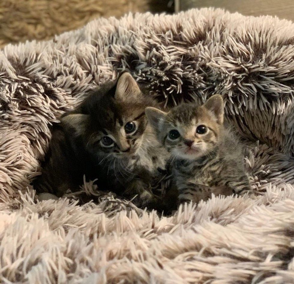 The other kitten was hiding under a towel, and when they removed it, a little ball of fluff was unveiled. They didn't have any information about the second kitten and had no idea how the two tabbies ended up together.
