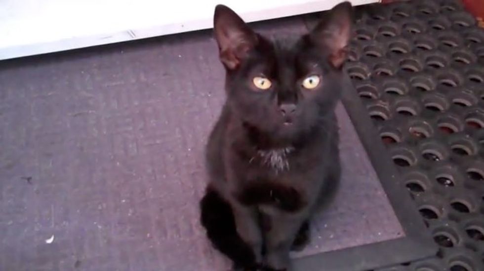 A tiny stray kitten showed up on a family's doorstep meowing to get in! He stood in front of the door and wouldn't move until the man opened the door for him.