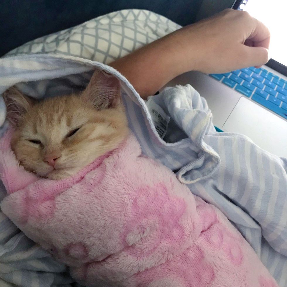 After every meal, Angie cuddles with her foster mom in a purrito, purring herself to sleep.