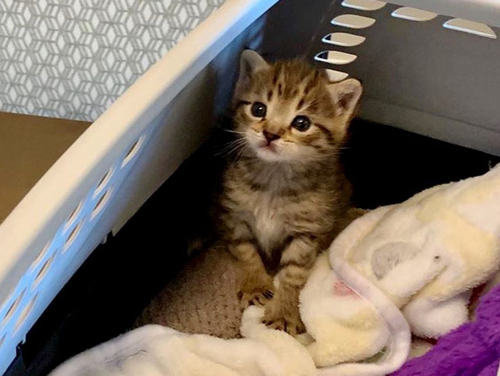 They immediately started searching all around for other kittens and the cat mom but to no avail. As they continued their effort to locate more kitties, they reached out to Debbie and asked if she could help the little guy.