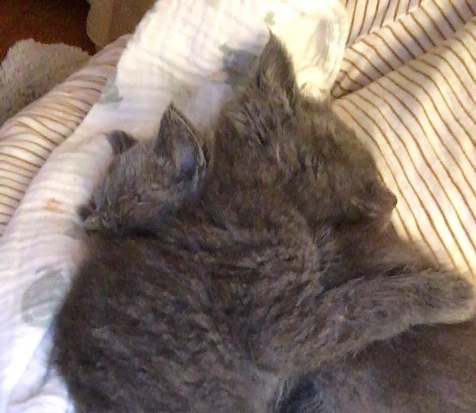 Two grey kittens were in rough shape when they were brought to a rescue group. The brother held onto his sister, trying to comfort her.