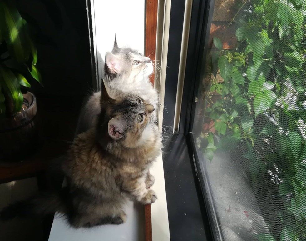 Whatever they do, they do it as a duo. The pair enjoys their daily Cat TV together by the window, spotting little critters outside, watching the day go by. They adore their people and seek affection from them in tandem.