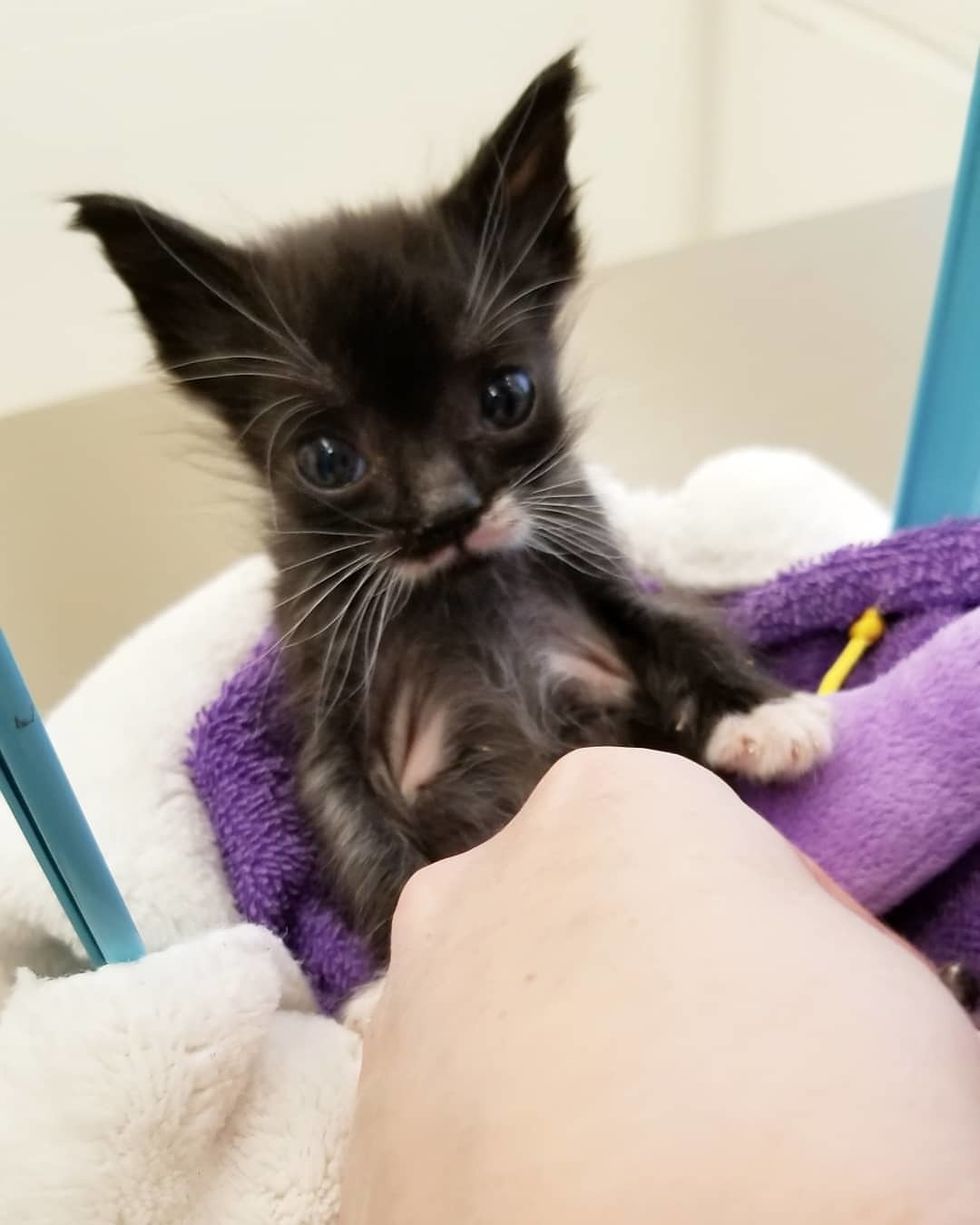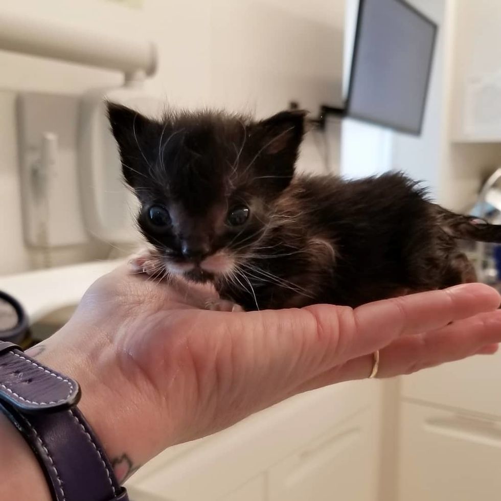 They brought the kitten to NOVA Cat Clinic where Ellen Carozza, Feline Licensed Veterinary Technician, took over to foster him as he needed special care.