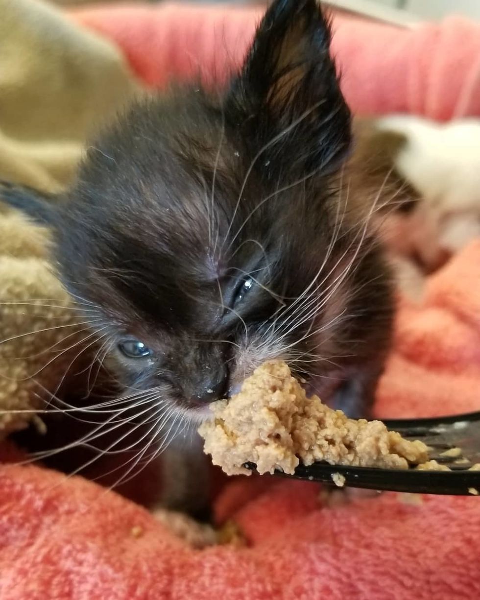 When Francis tried kitten wet food for the first time, he scarfed it down like a champ.