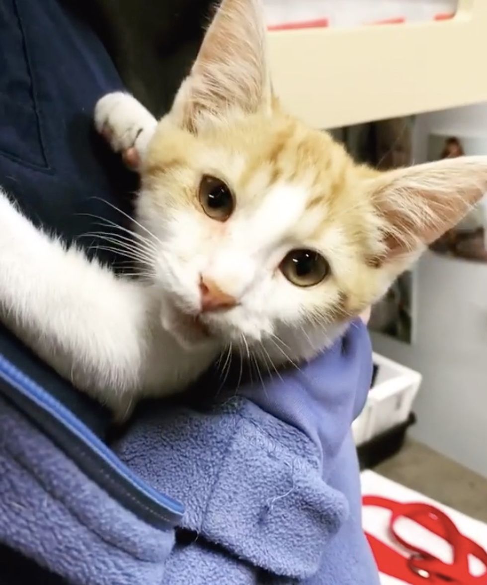 Despite a rough start, the kitten was in good spirits and just wanted snuggles. While being hospitalized, staff took turns to visit him as he was meowing nonstop for attention.