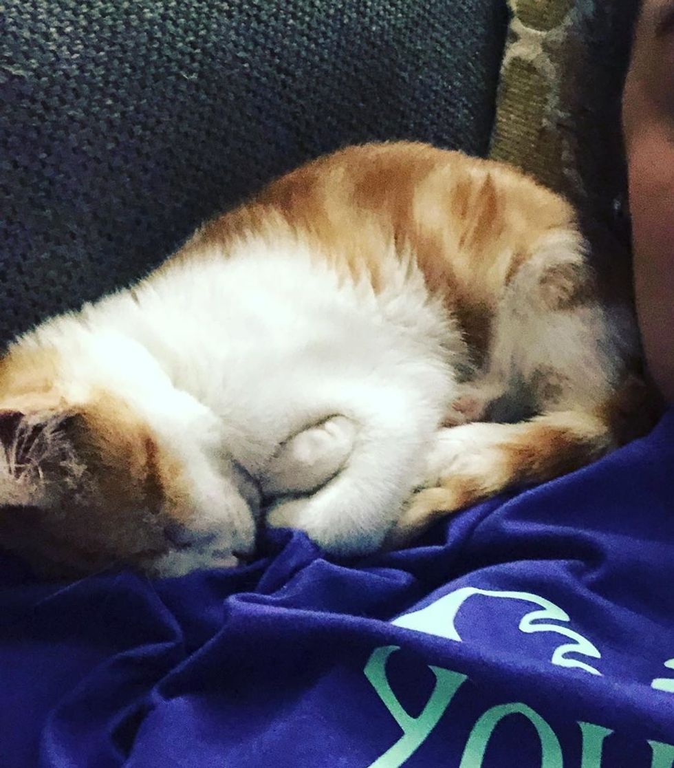 The little former stray has blossomed into an expert cuddler and napper.