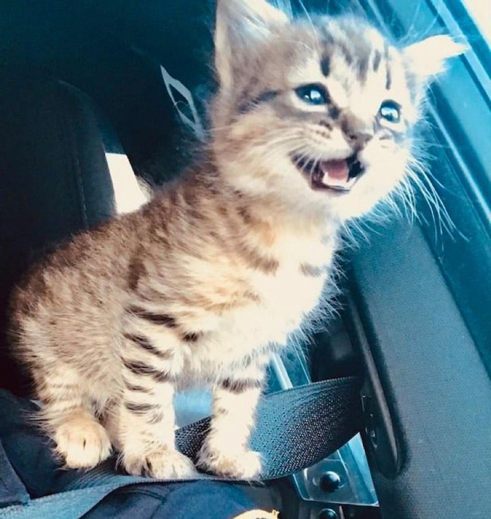 He roared with his adorable little meows while he stood tall on Rowsey's shoulder, as if he was ready to leave the street life behind.