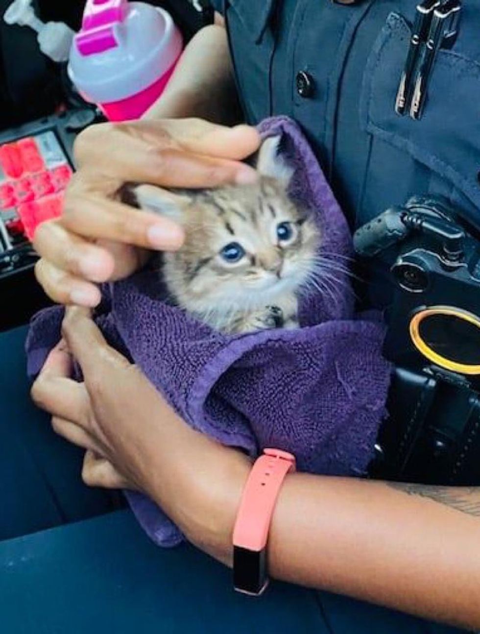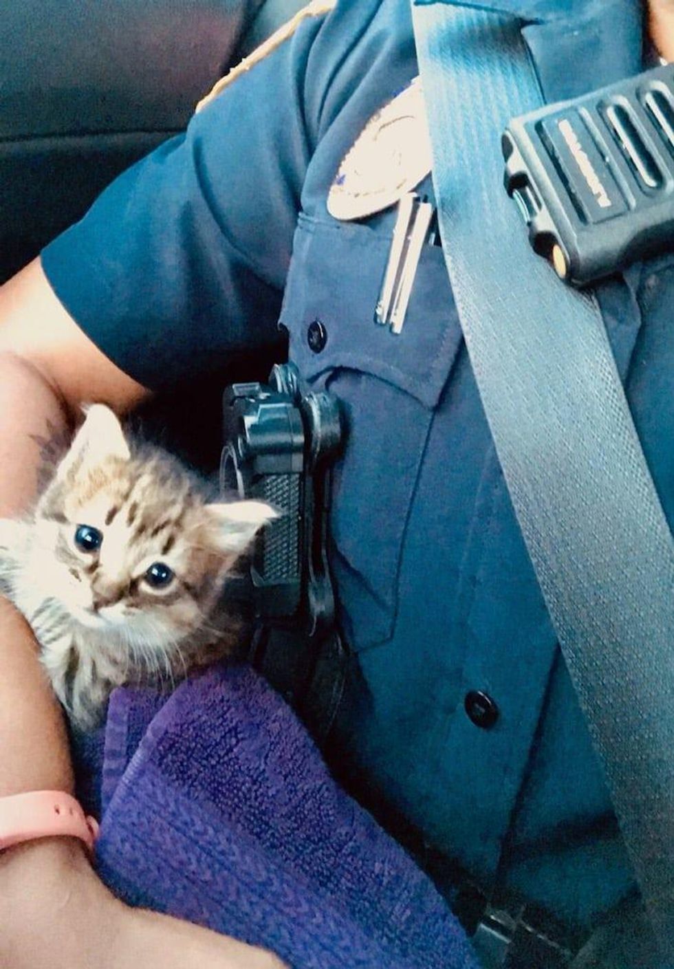 They couldn't leave the kitten out to fend for himself, so Rowsey brought him back to her squad car and wrapped him in a towel to soothe him. The frightened little tabby was able to calm down while being held by the officer. With a lot of pets, cuddles and reassurance, the little guy came out of his shell.