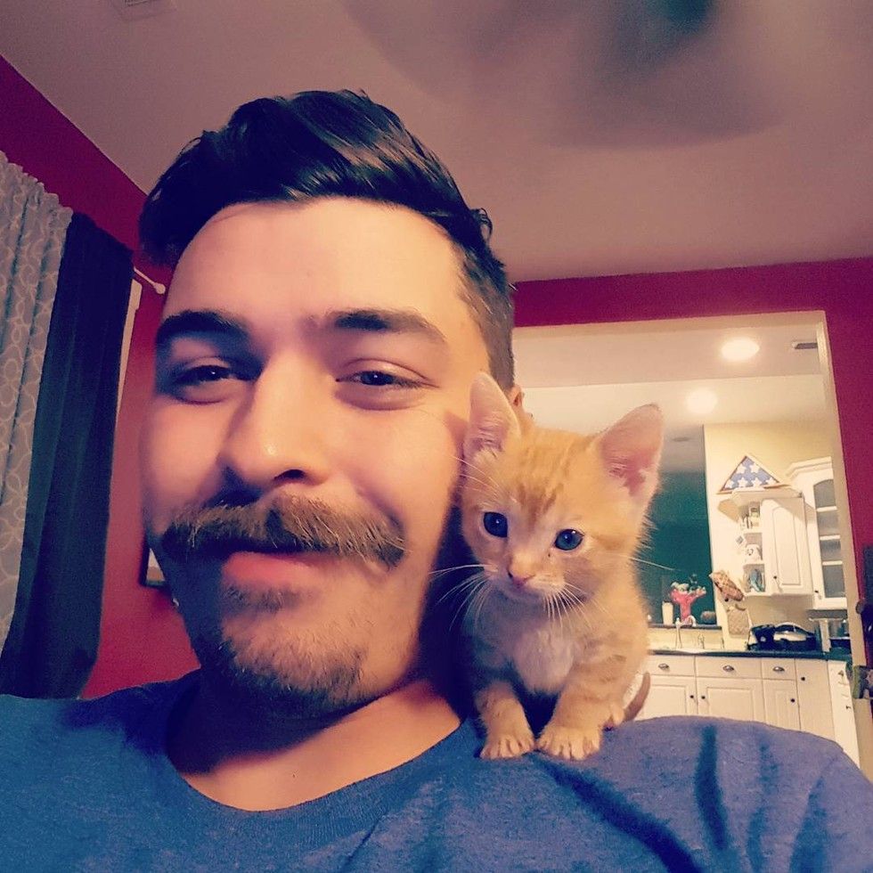 A tiny rescued kitten found his way onto a man's shoulder and decided he would be his partner for life.