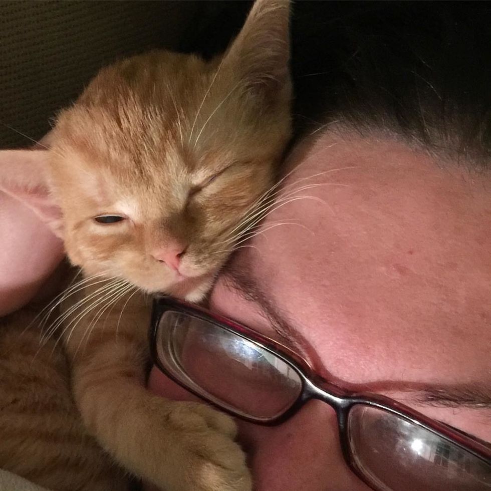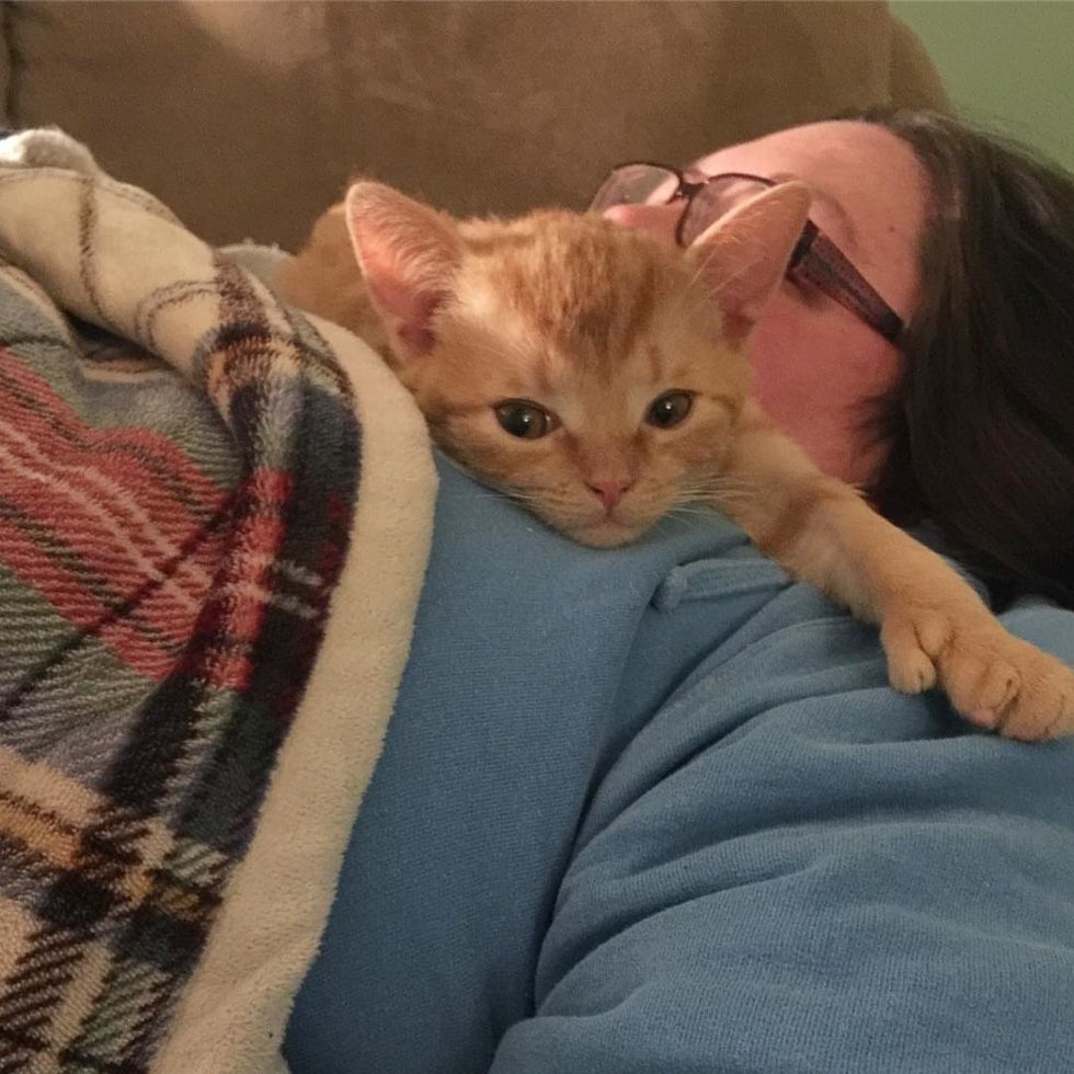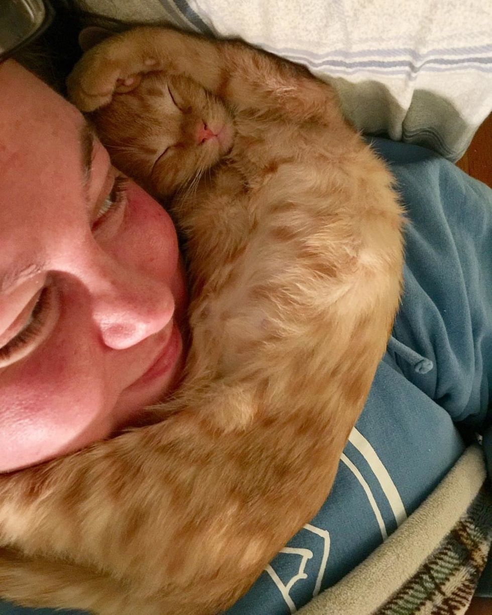 Tate will sleep on Jen instead of her regular cat beds. They snuggle on for hours until she wakes up.