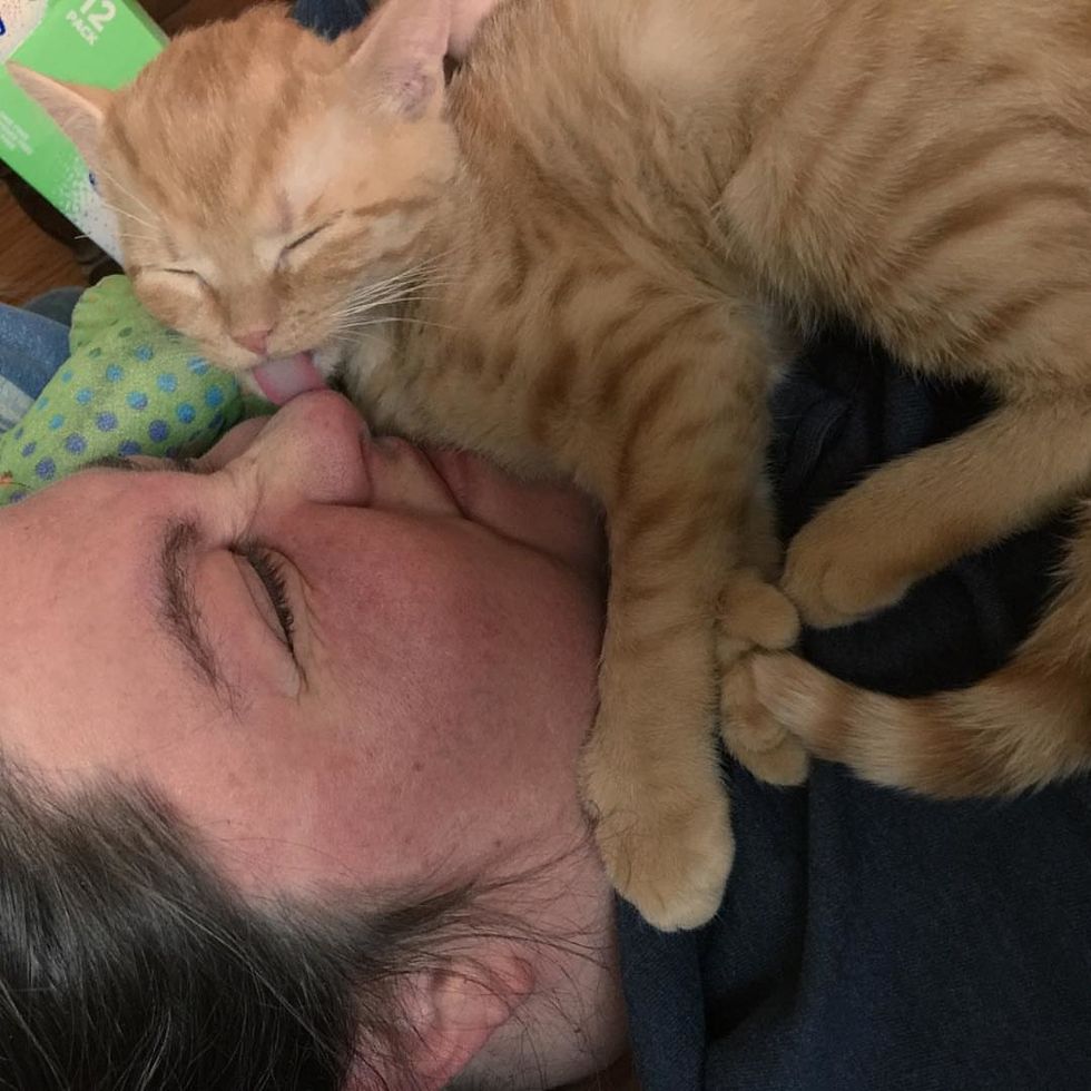 This amazing little kitty continues to give her humans cuddles every day, doing what she does best.