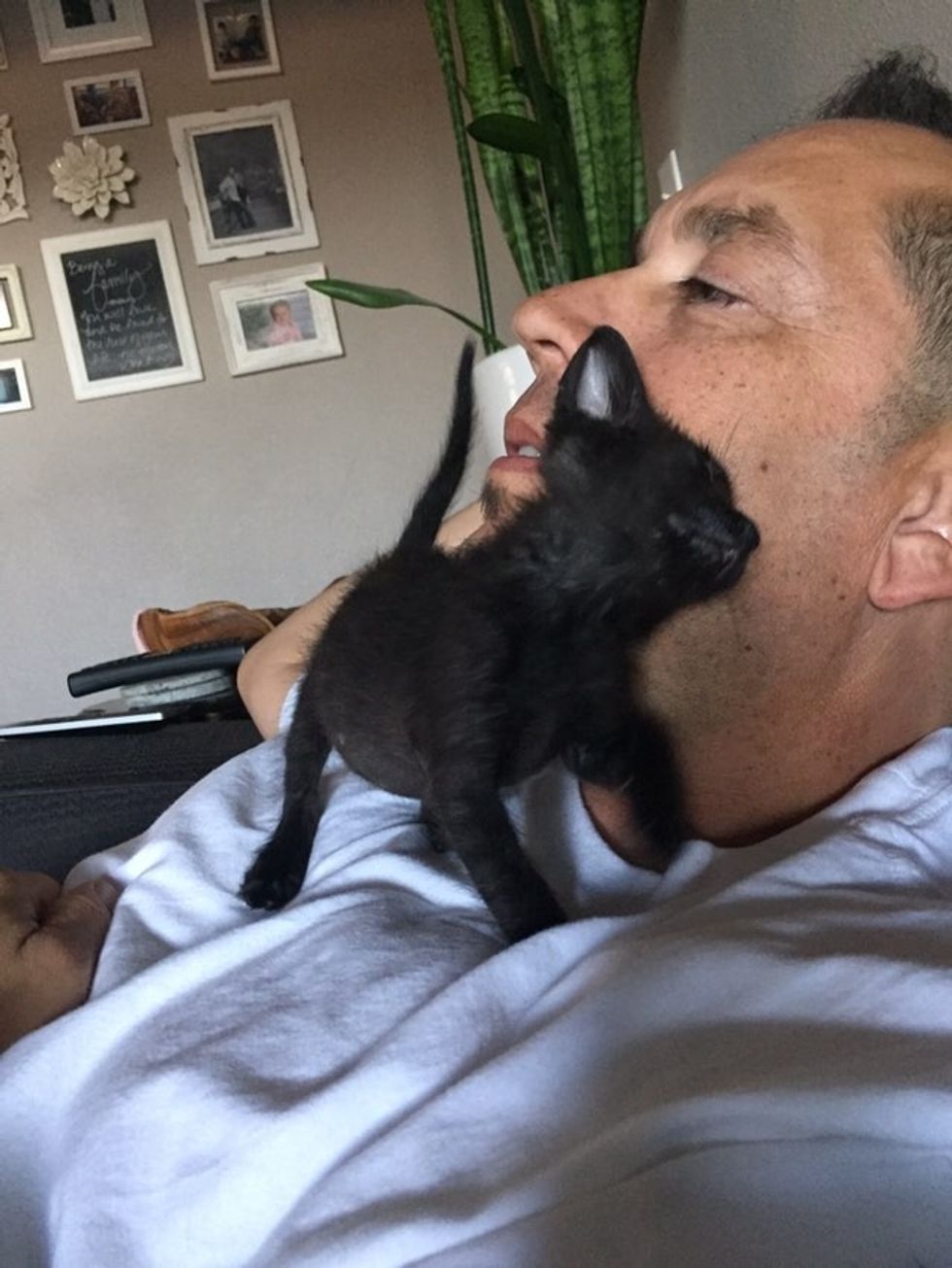 Once the kitten was cleared by the vet, Danielle brought him home where he met Foster Dad Elu.