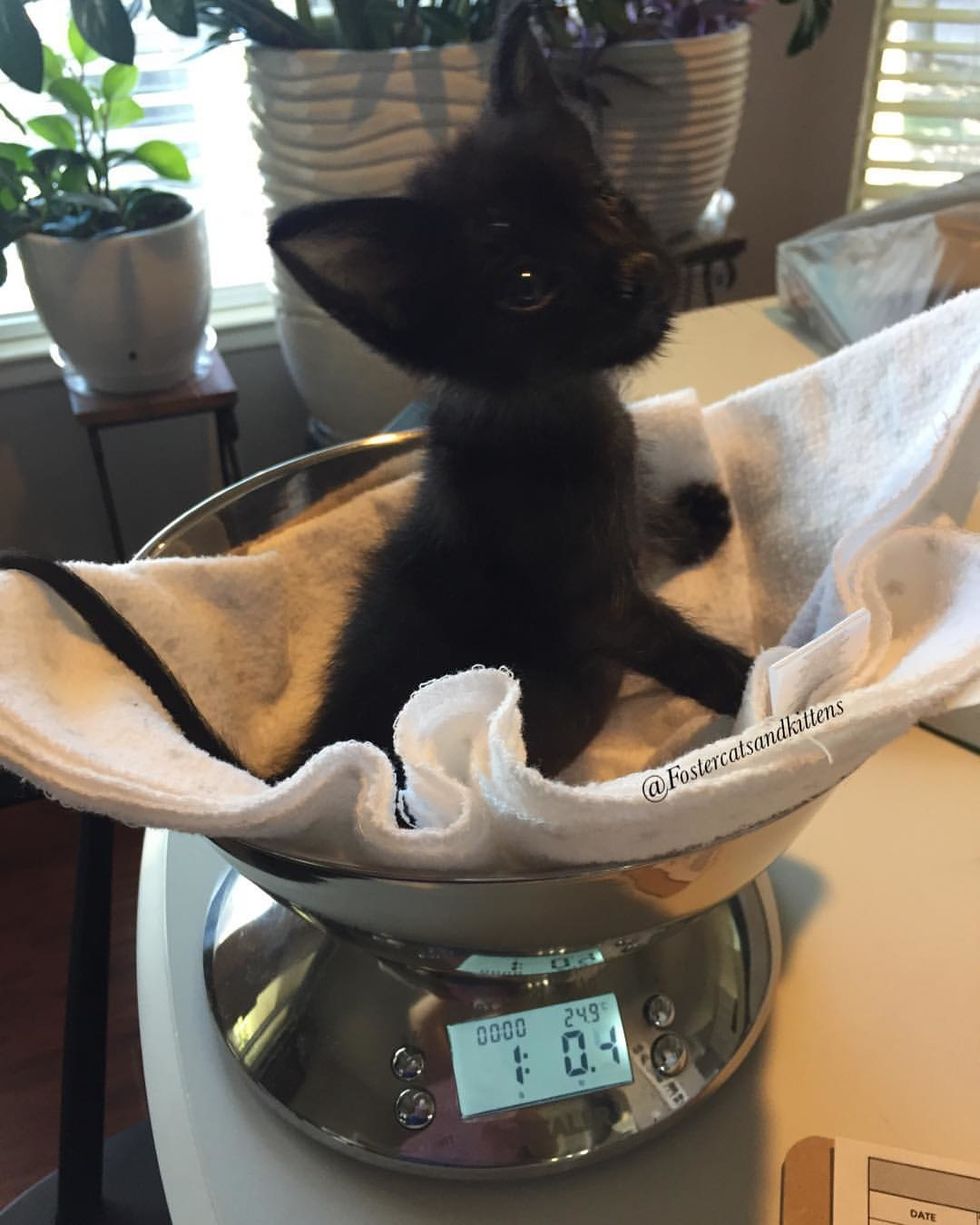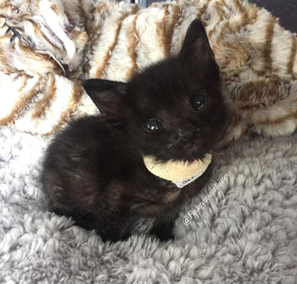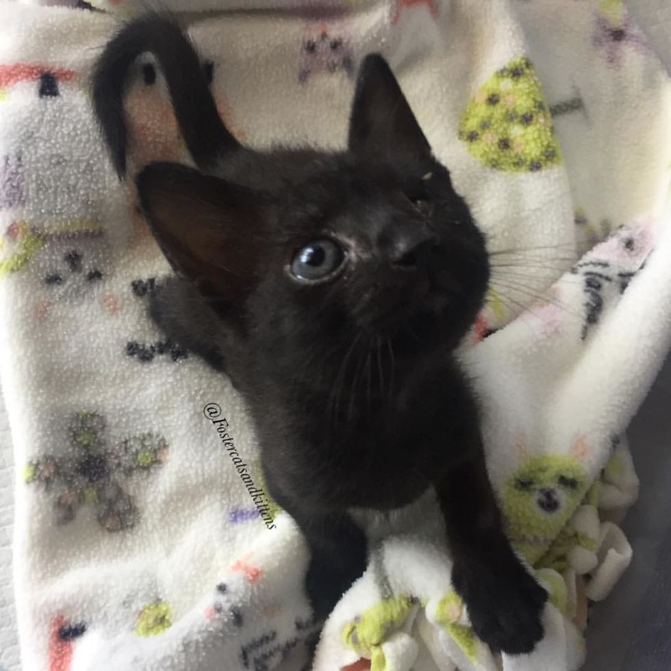 A teeny black kitten came to a veterinary clinic, in need of foster care. He was very wobbly and extremely tiny for his age.