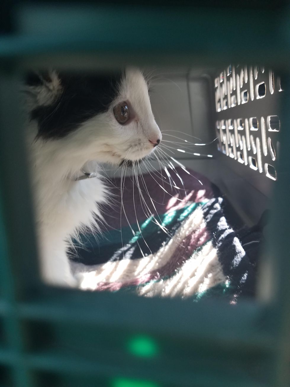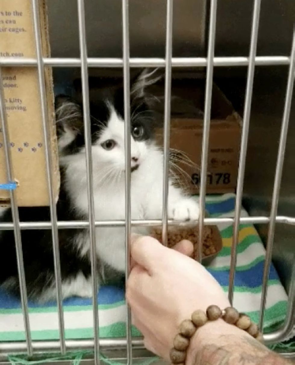 The black and white fluffy kitty stopped the couple and started meowing and pawing at them. She stared into their eyes as if she was telling them to take her home.