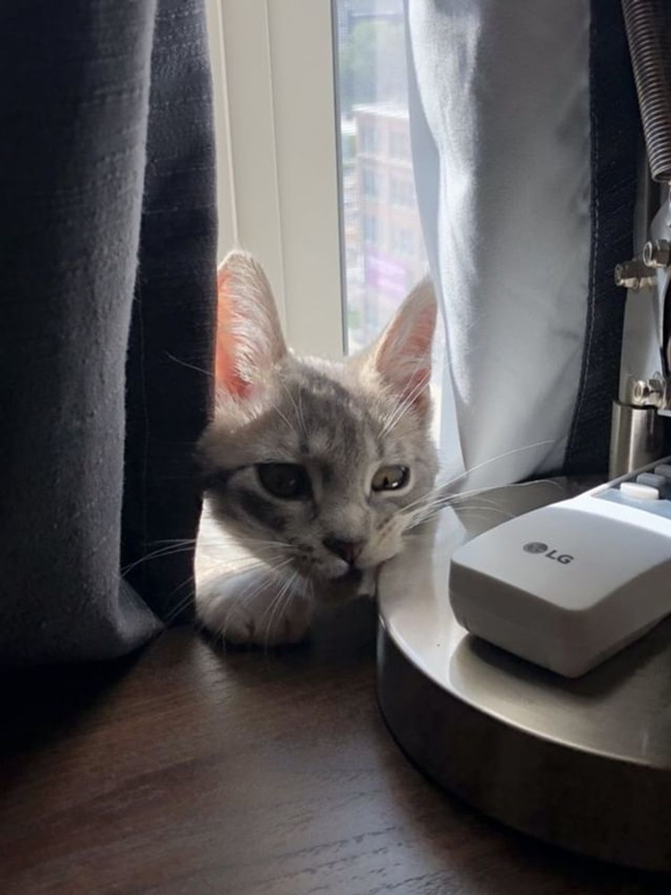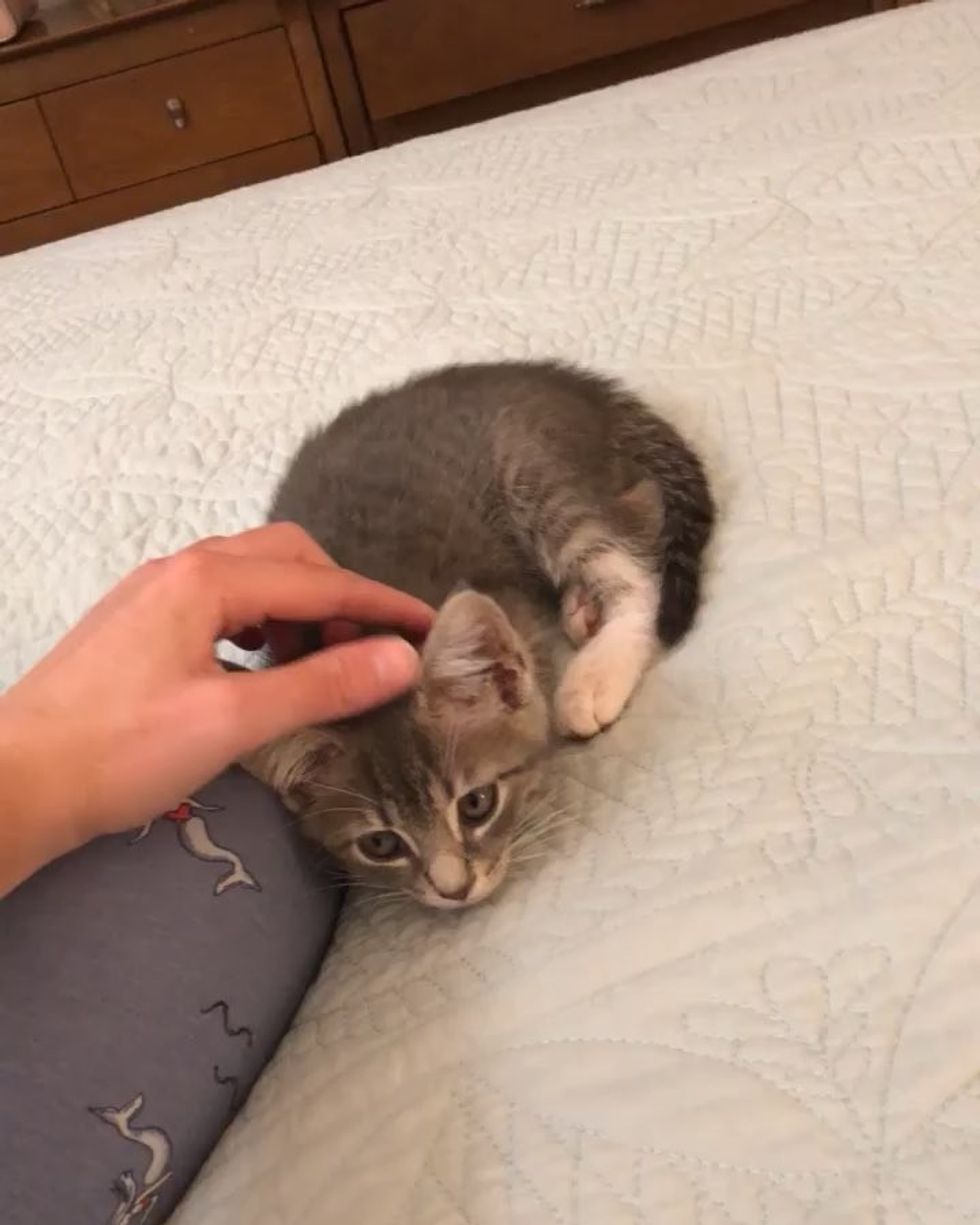 A few weeks later, they welcomed a new kitten into their family. Puig took to her and started cuddling.