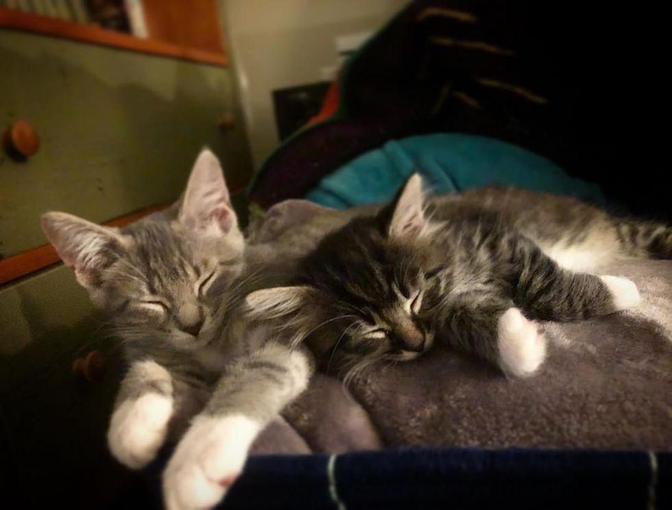 "Puig needed a friend to play with after Kitsy recently passed away (at 19 years old, she was my best friend since I was six) so we rescued another kitten, Waffle, in her honor."