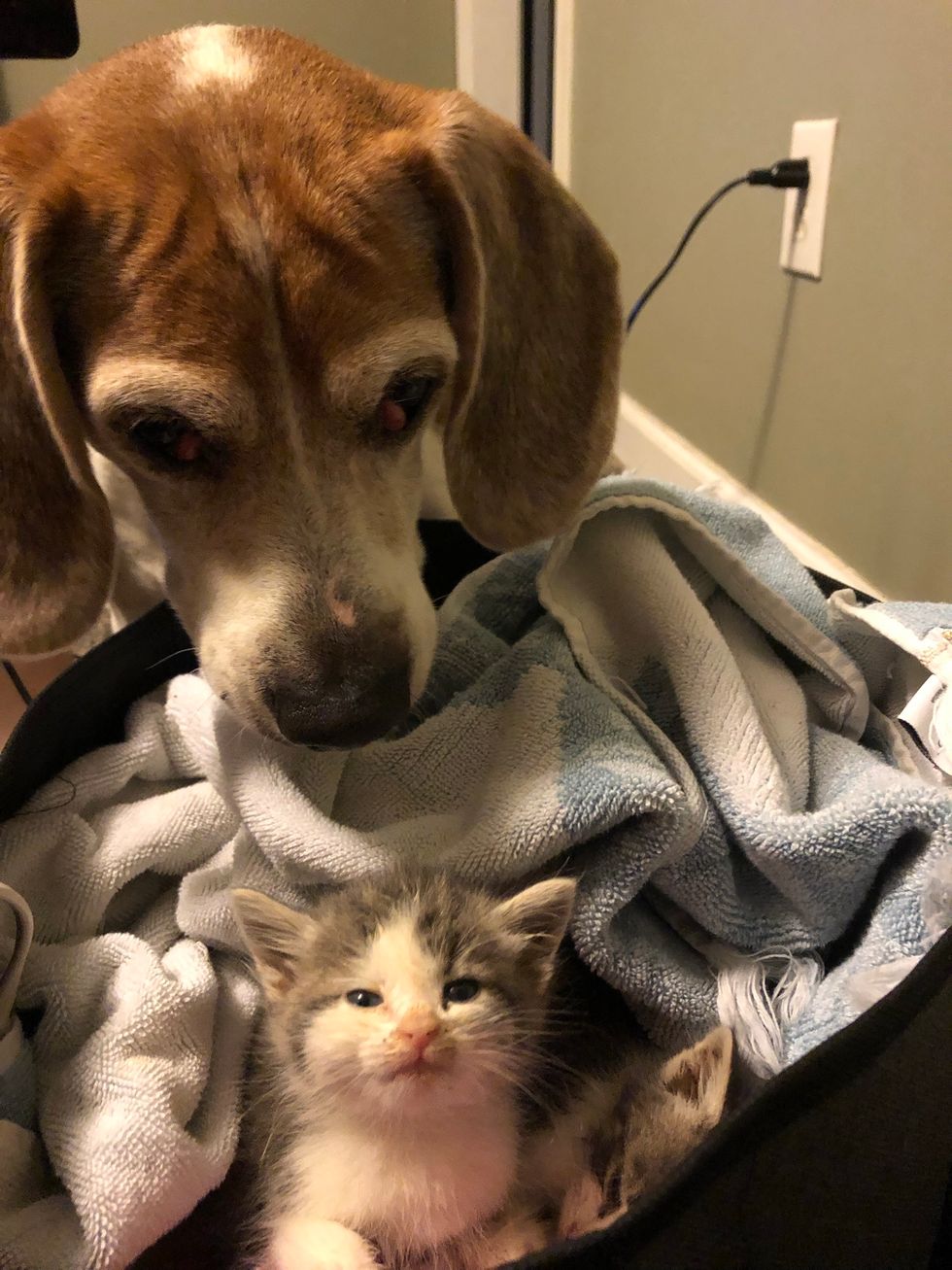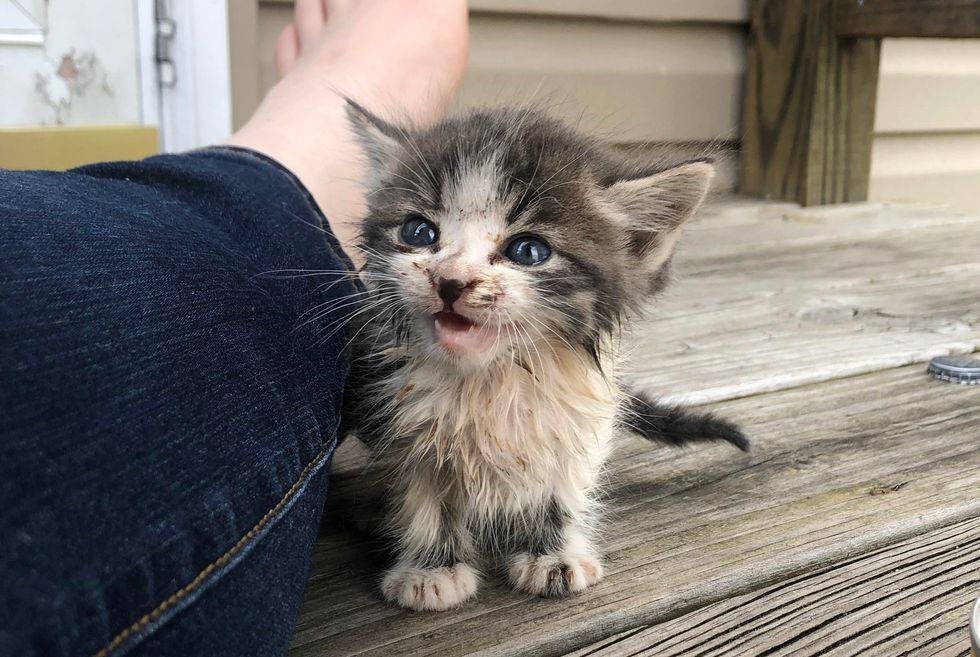 Hannah came outside and saw the kitten crying and purring at her nonstop. As she scooped him up and was about to head back into the house, she heard the pitter-patter of little paws coming from behind.