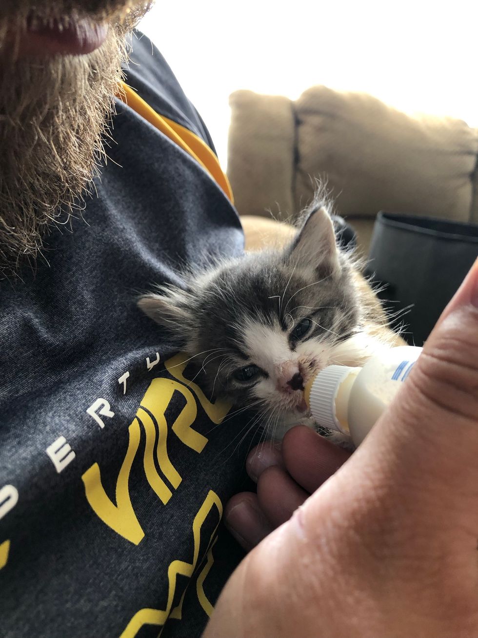 "Theon has found a fondness for the bottle and KMR (Kitten Milk Replacer)."