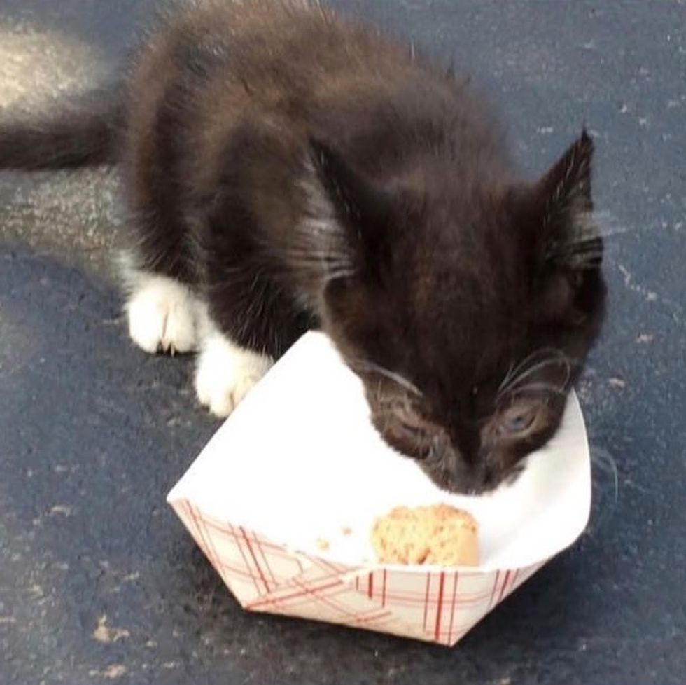 She placed some food in a paper bowl and offered it to the kitten. The little tuxedo was too hungry to resist the gesture and eventually came out from hiding.