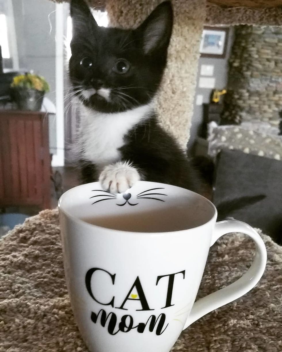 The sweet tuxedo was so happy that she was meowing with her tail up in the air while getting helped.