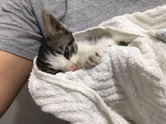 Marisa slowly approached the stray, trying not to startle him, but the kitten was so exhausted that he just let her scoop him up. She rushed him back to her apartment, gave him water to rehydrate him.